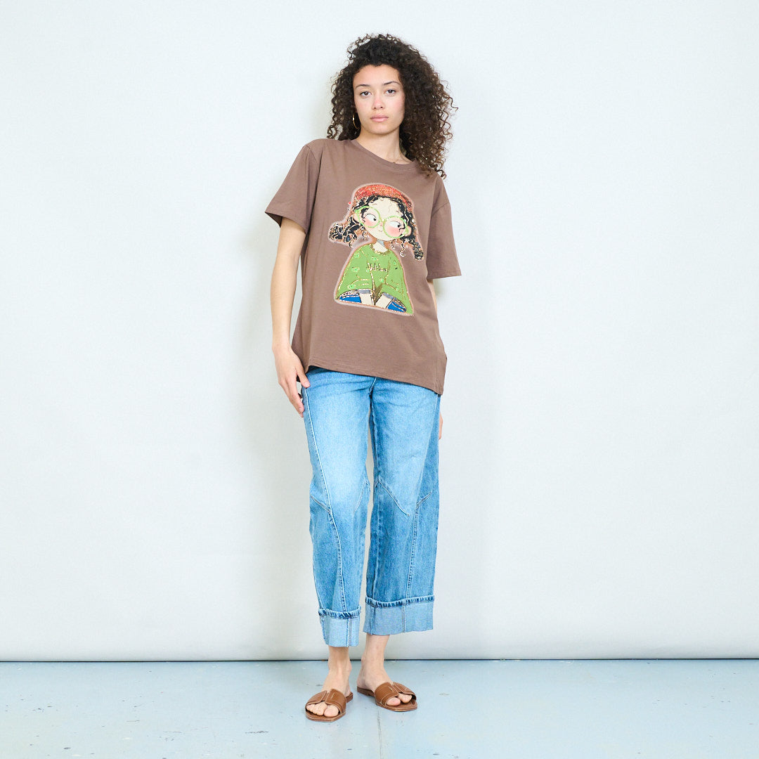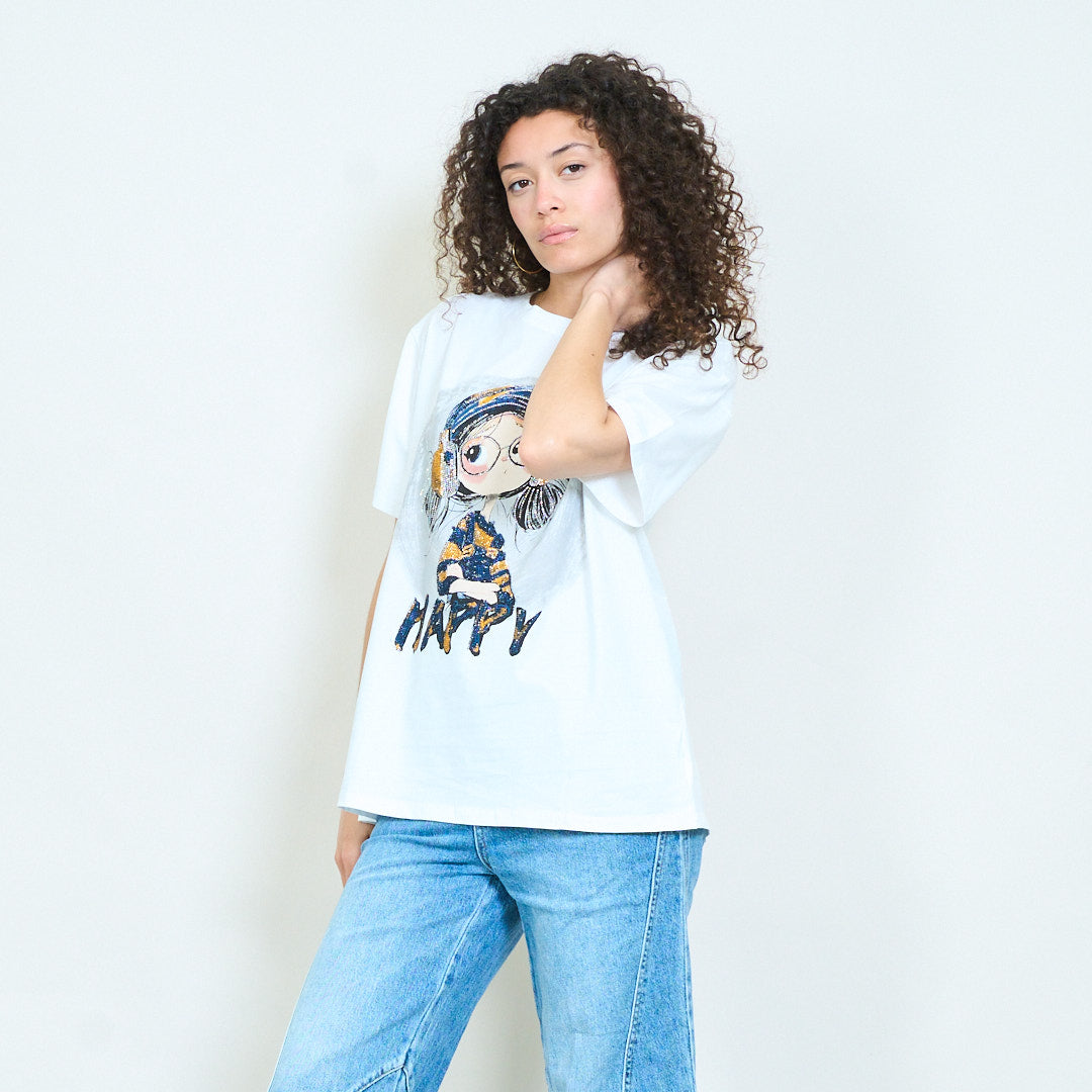 Graphic cartoon girl "Happy" print sequins embellished relaxed t-shirt wholesale
