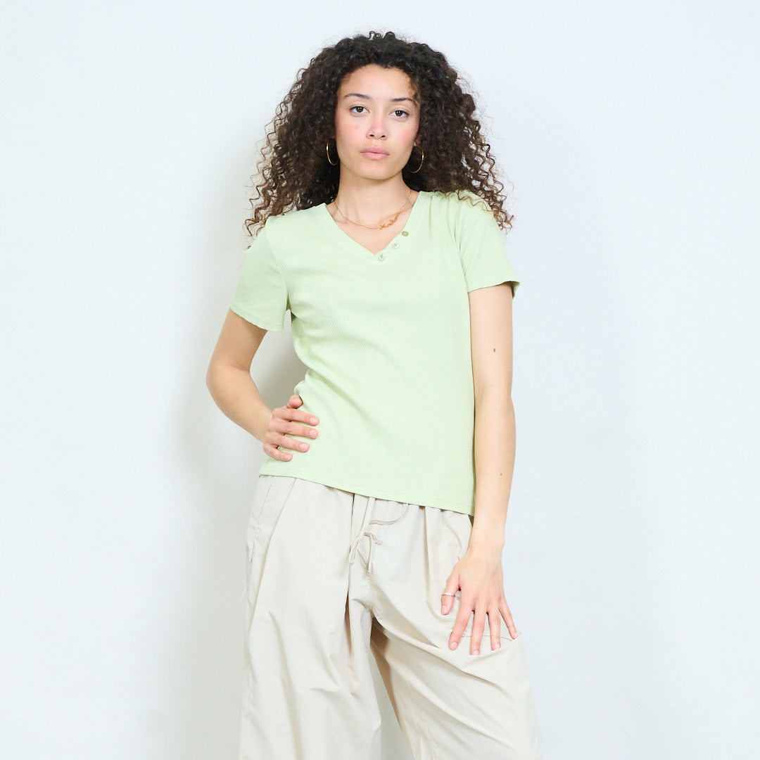 Ribbed fitted short sleeve t shirt with button detail neckline wholesale