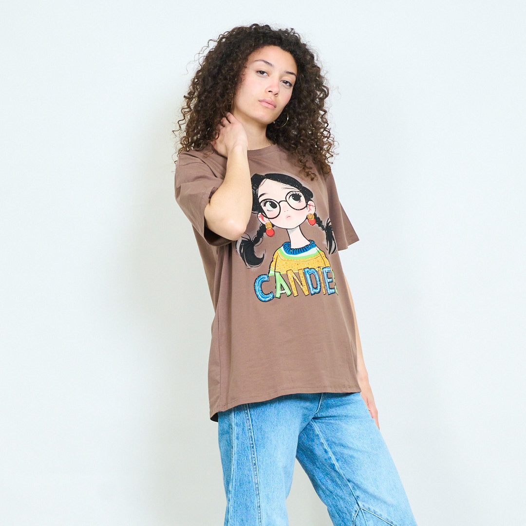 • Short sleeve t-shirt featuring a cartoon girl graphic with "Candies" text print