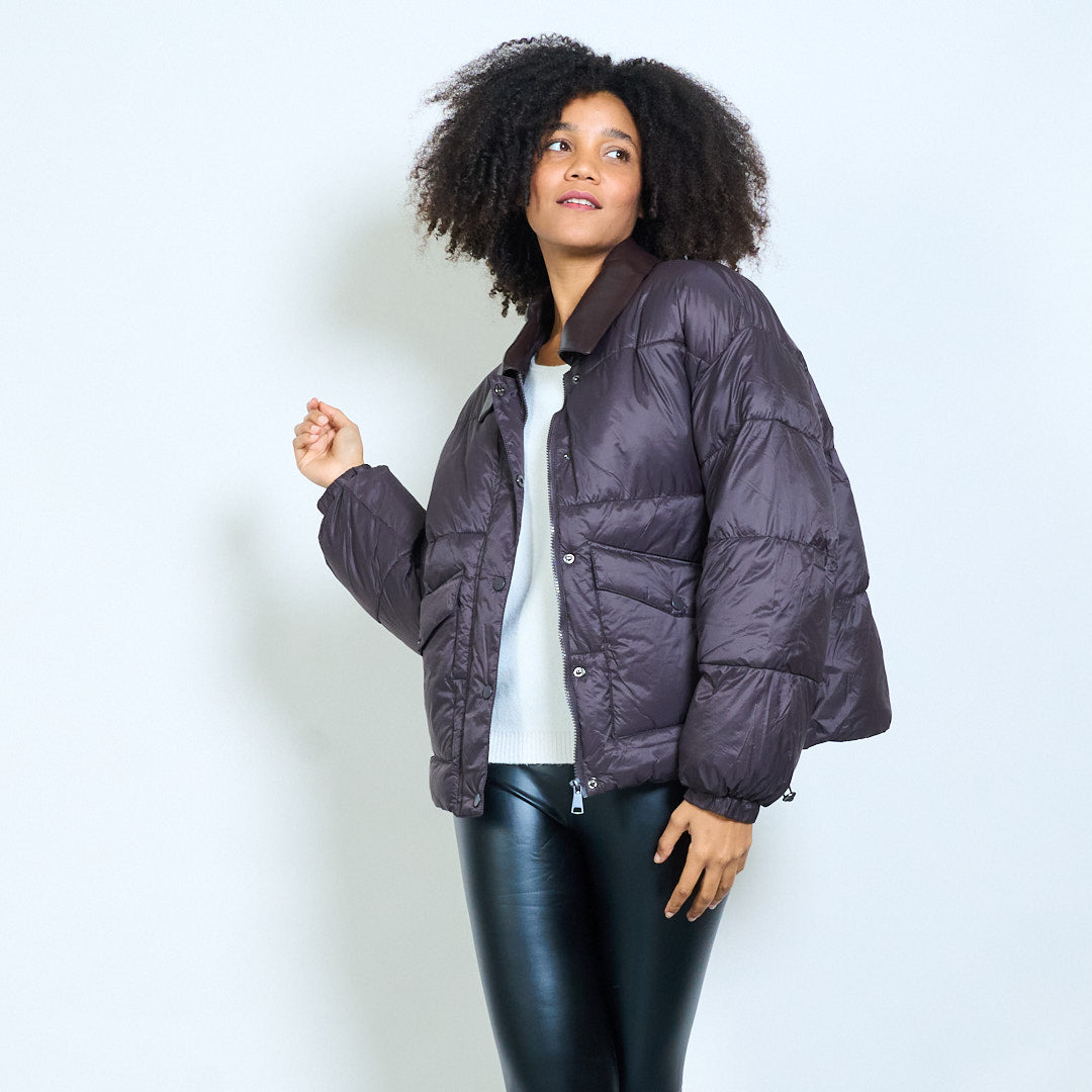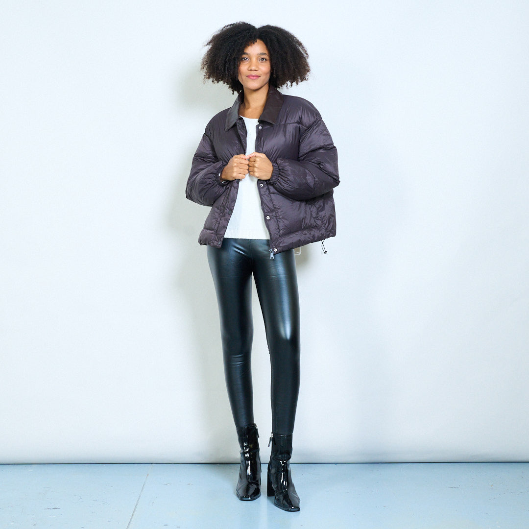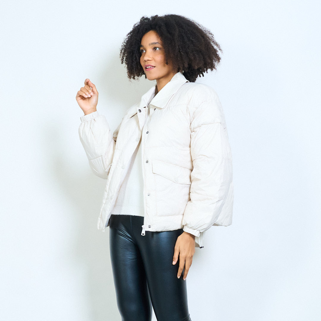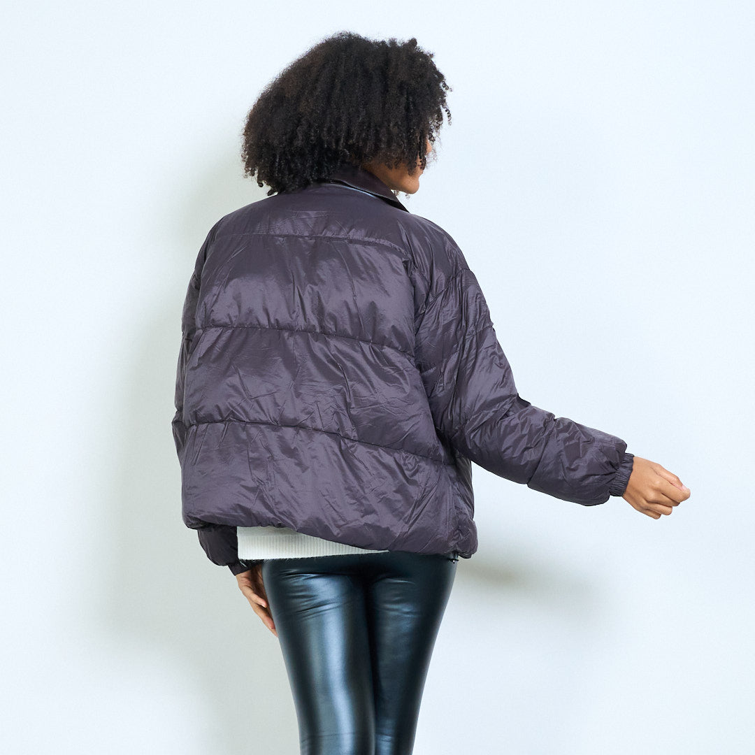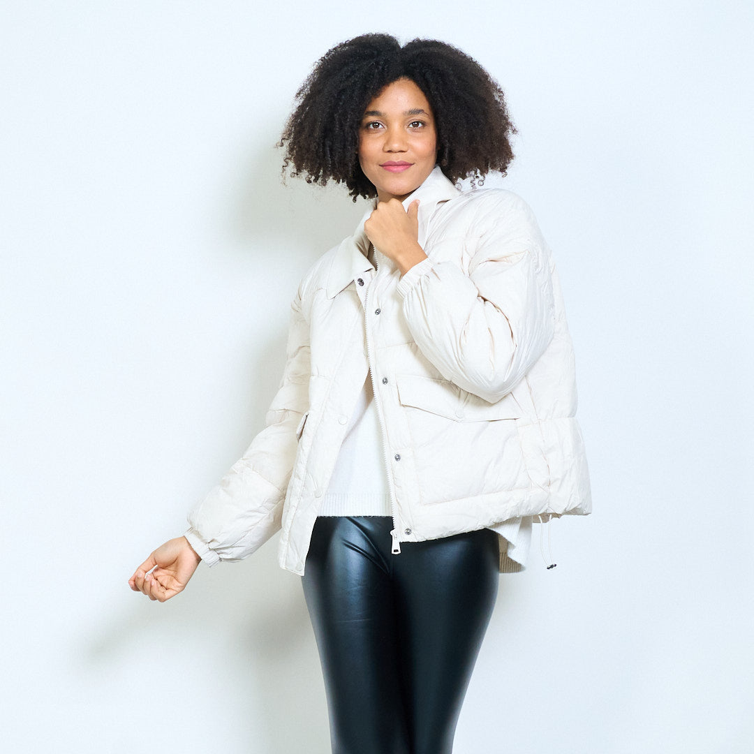 - Cropped puffer silhouette adds a trendy twist to a winter essential