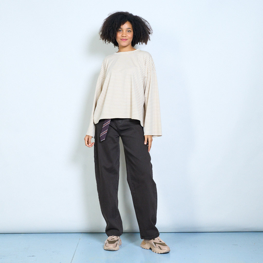 - Features a bold striped pattern that adds a modern touch to any outfit