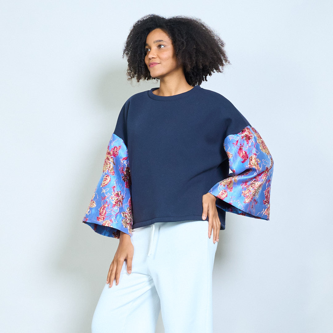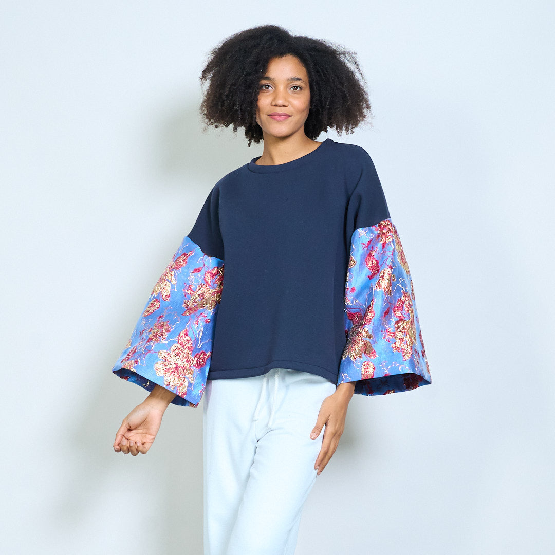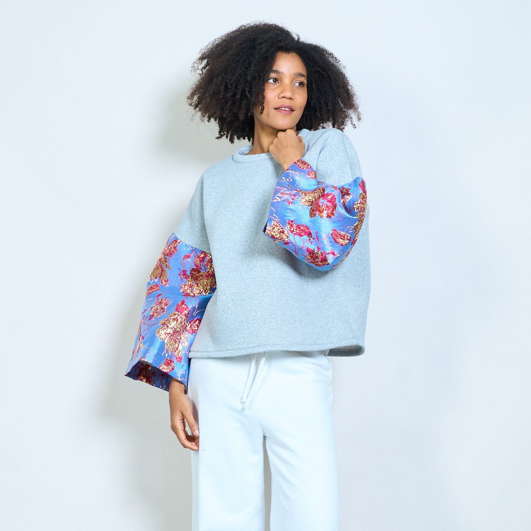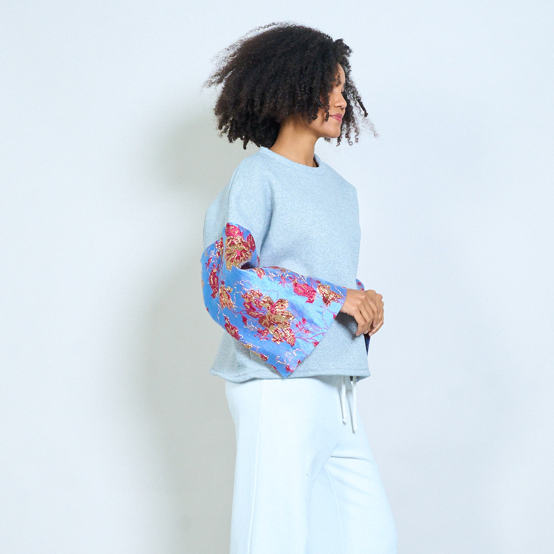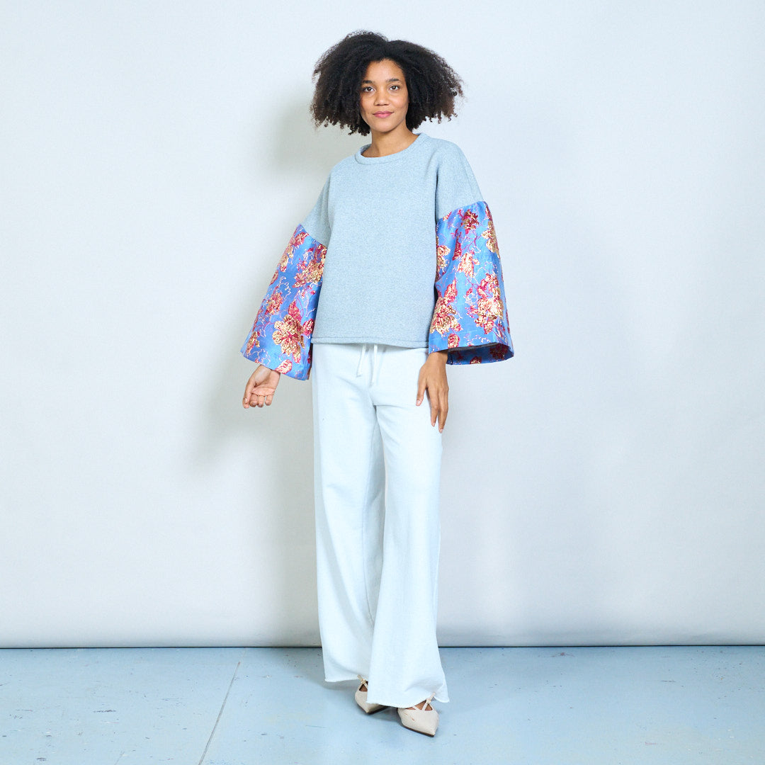 Contrast embroidered floral bell sleeve soft knit sweatshirt wholesale