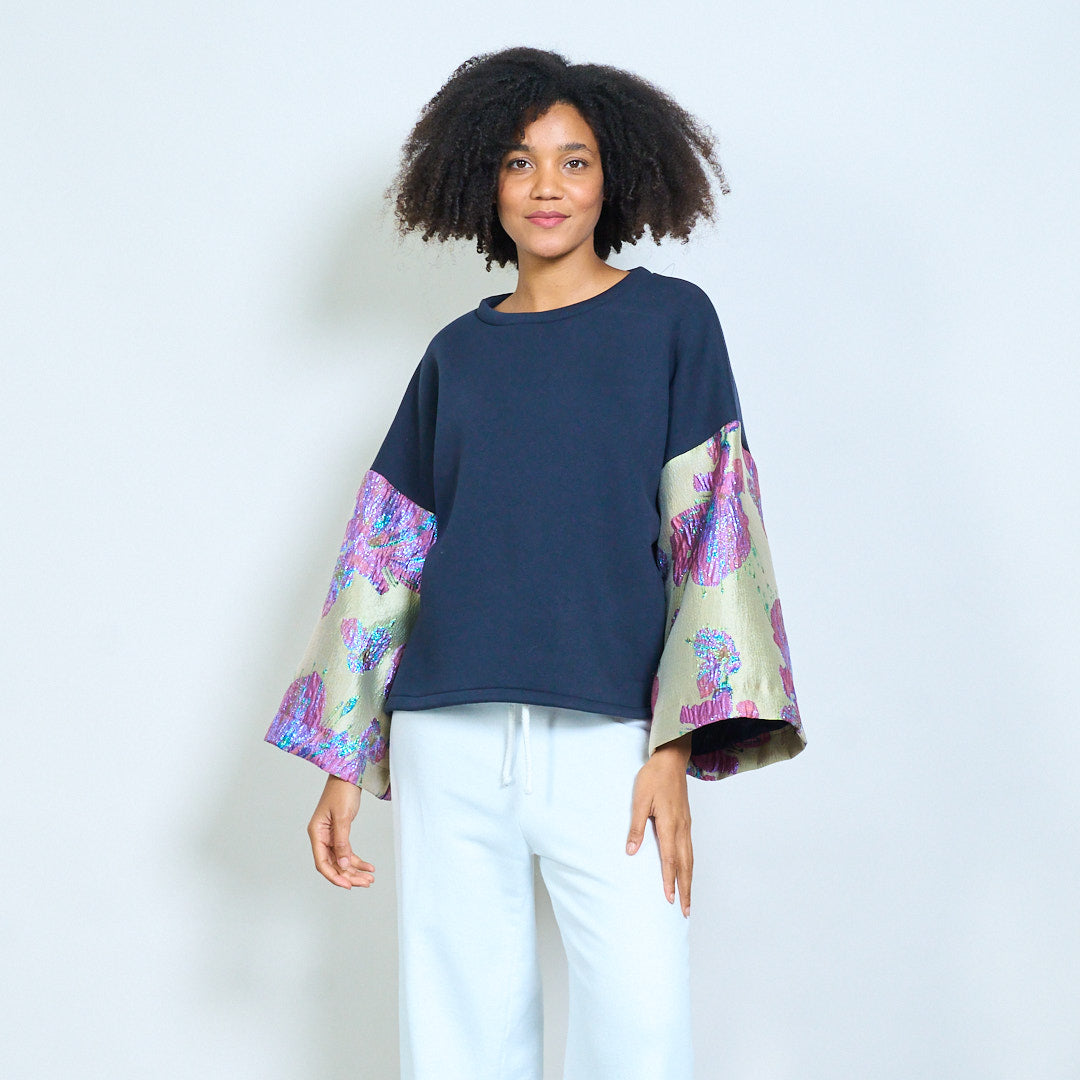 - Features eye-catching floral sequin sleeves for a stylish contrast effect