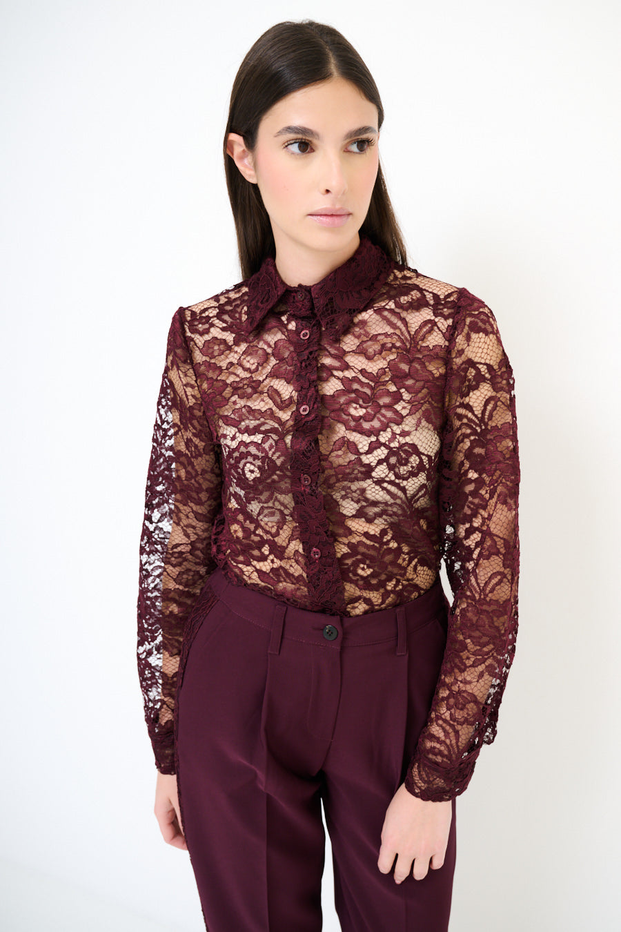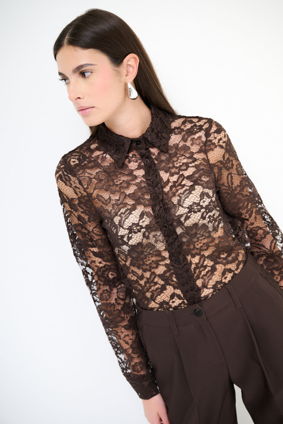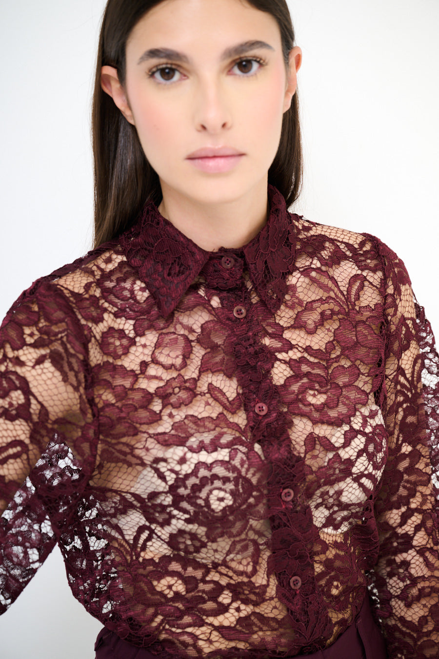• Long sleeves with lace detailing adding sophistication and texture