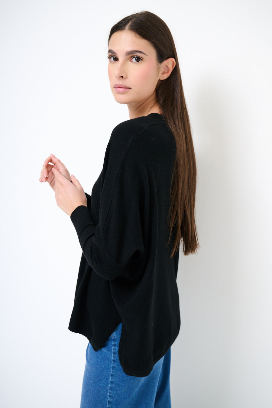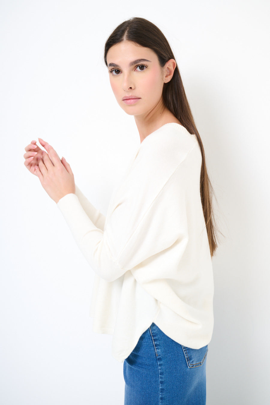 - Cozy oversized knit sweater with a soft drape and relaxed silhouette