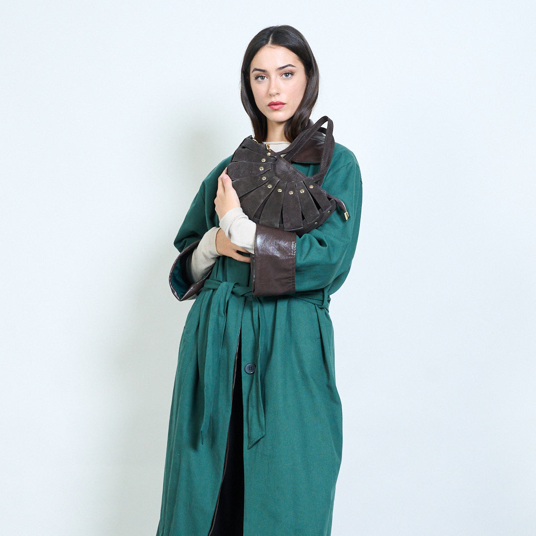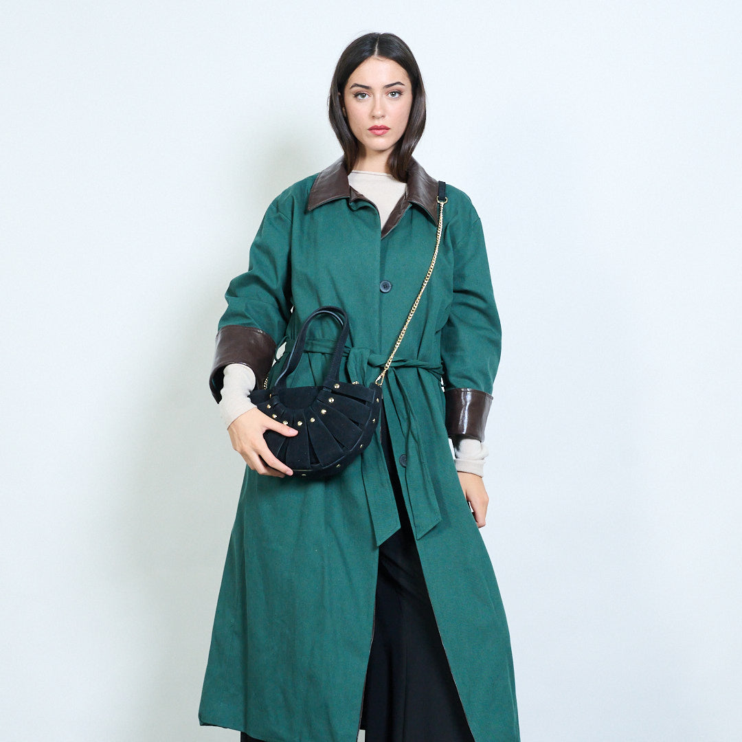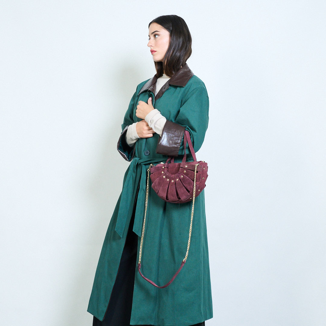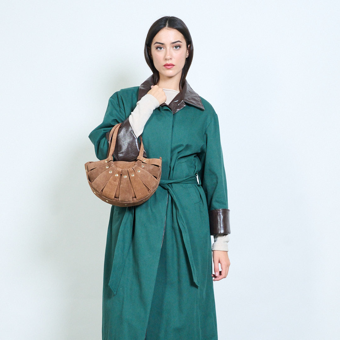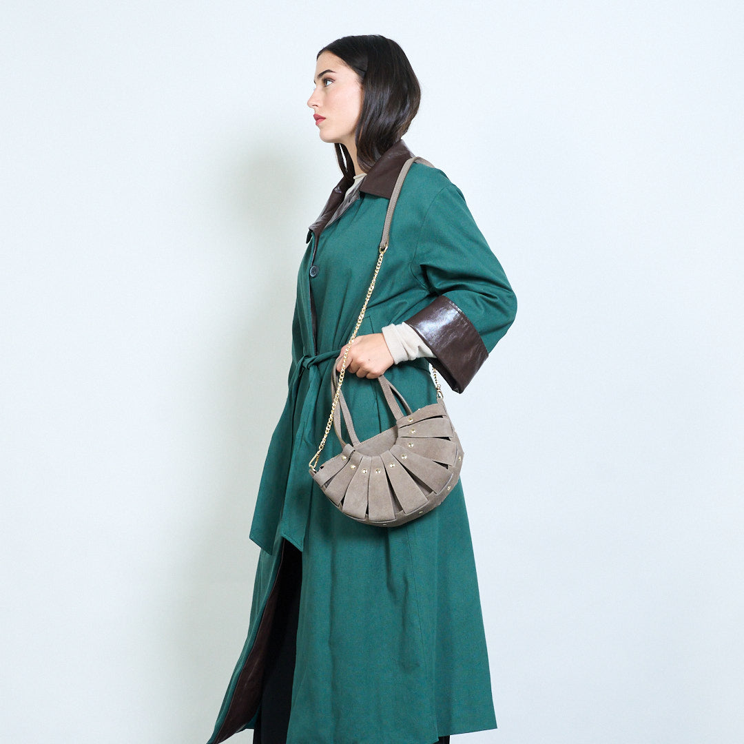 - Features a unique pleated half-moon design for a chic and modern silhouette