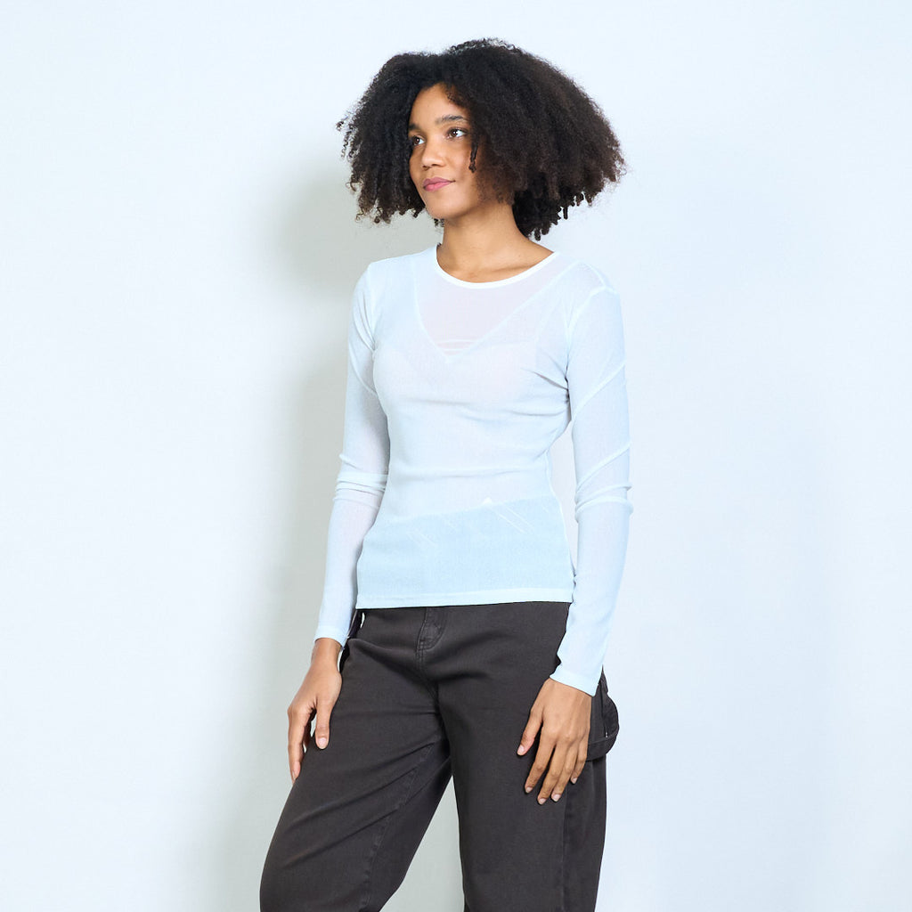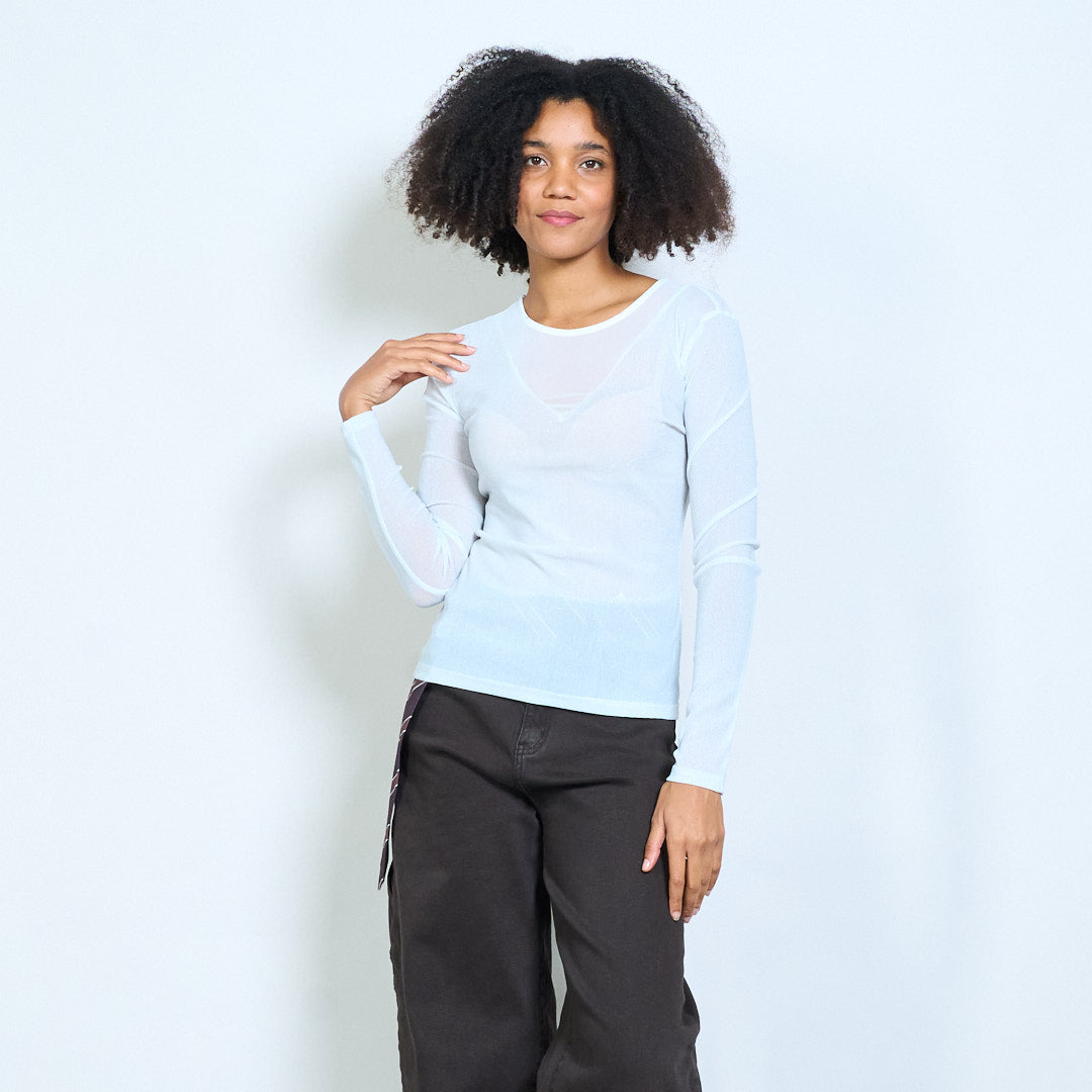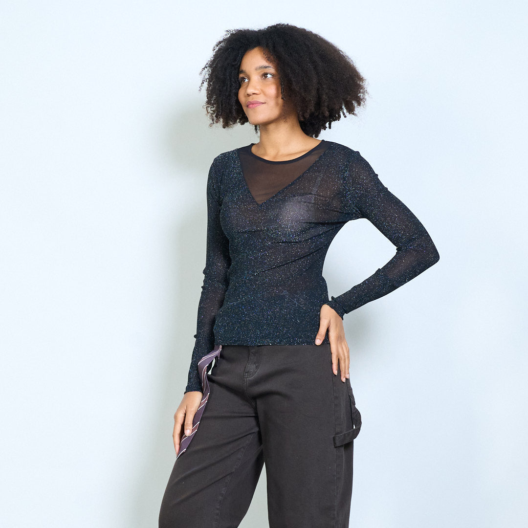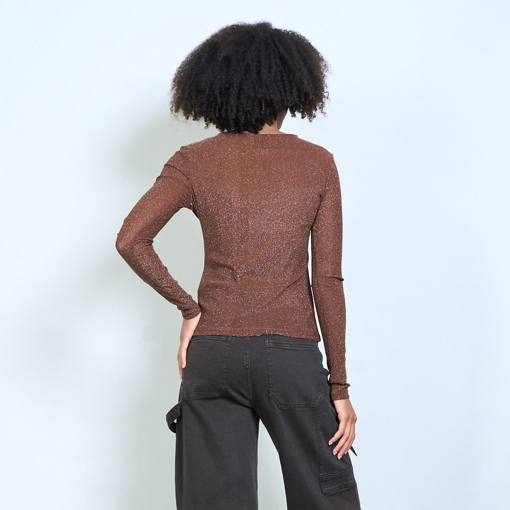 Sheer shimmer mesh long sleeve fitted top wholesale