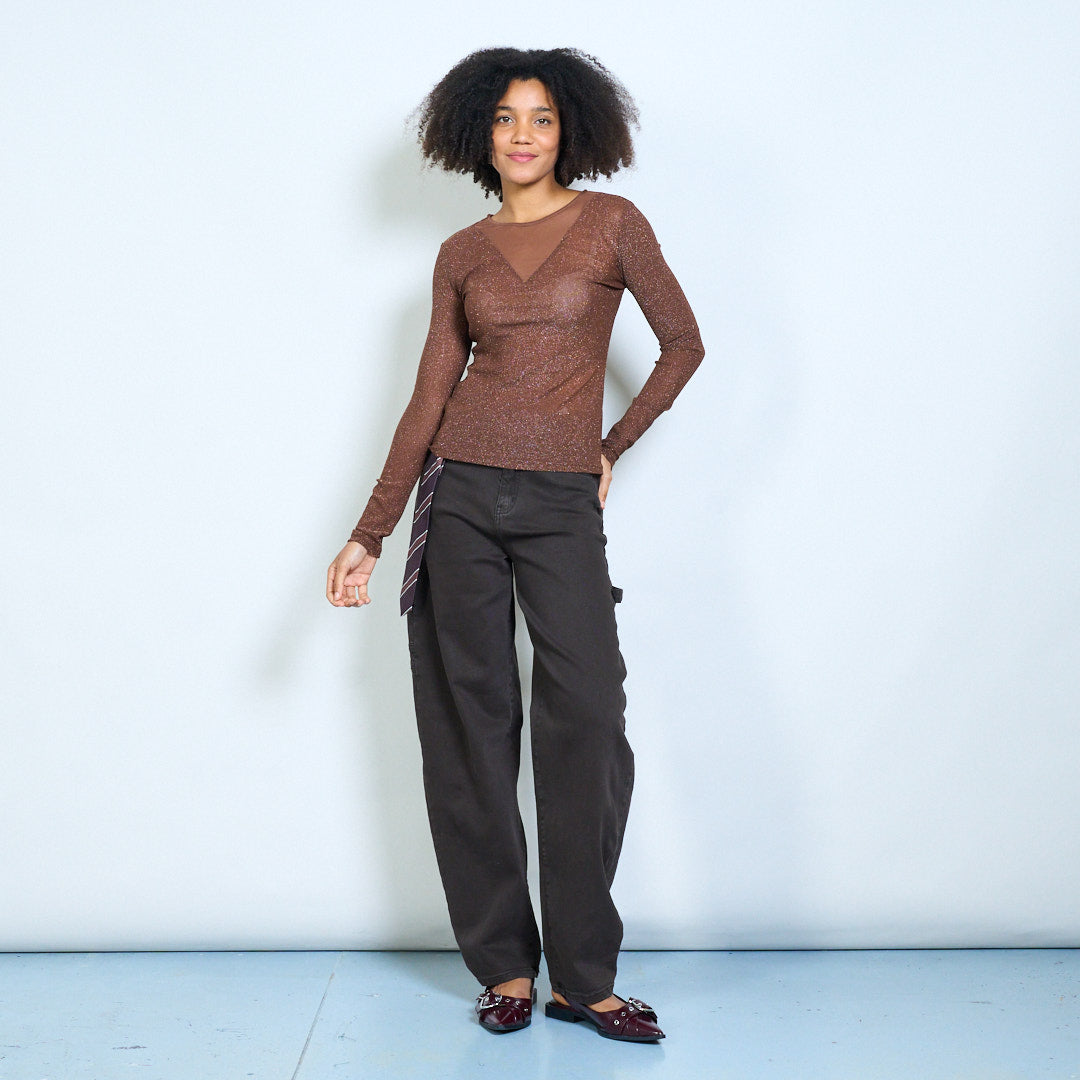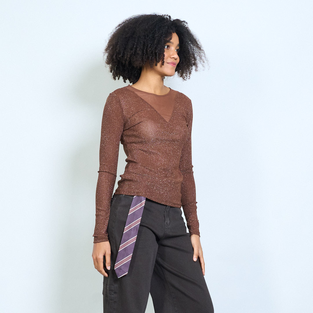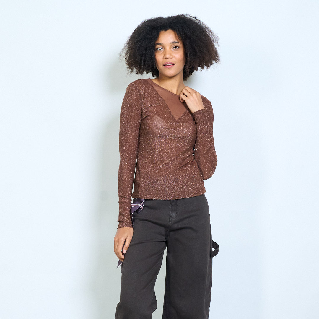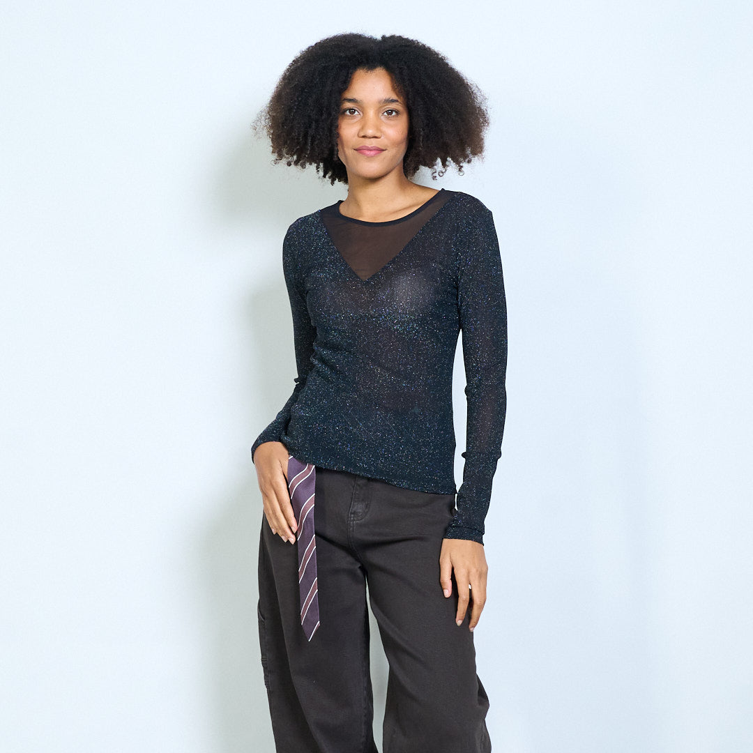 Sheer shimmer mesh long sleeve fitted top wholesale
