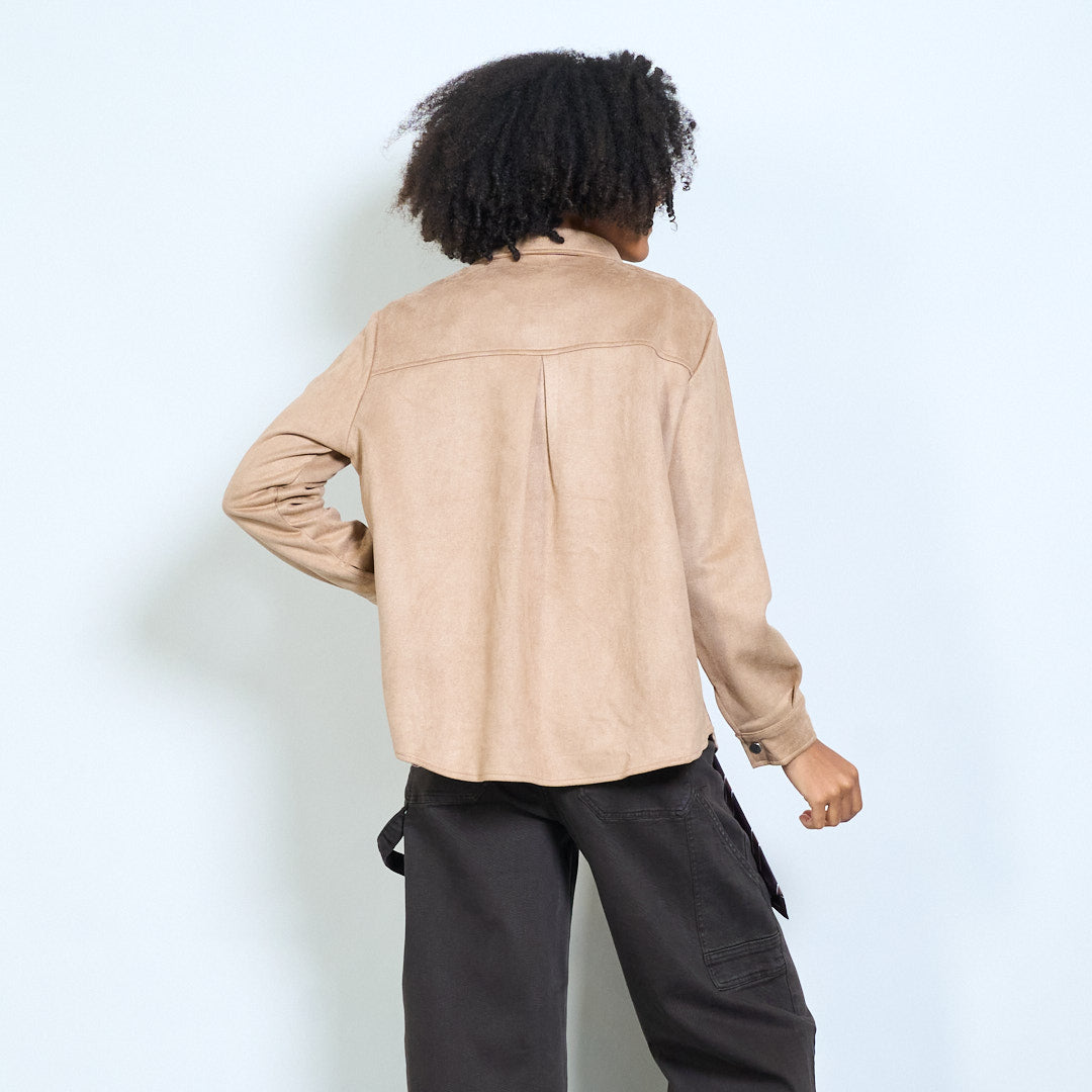 • Long sleeves with buttoned cuffs create a polished silhouette