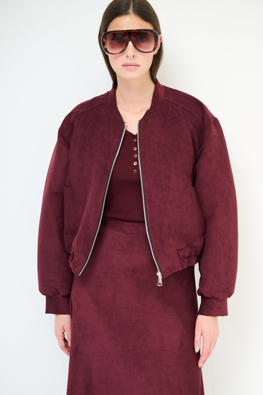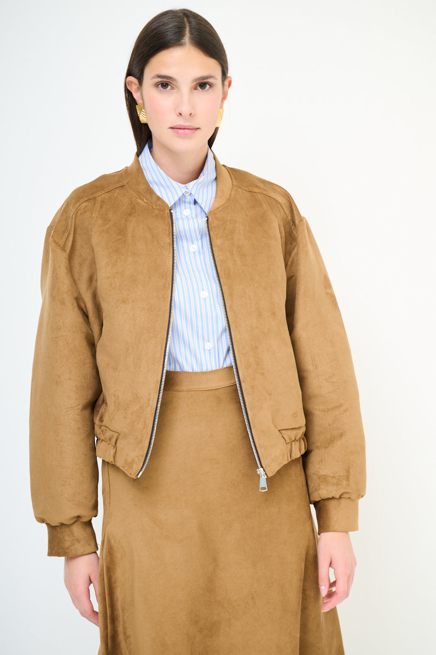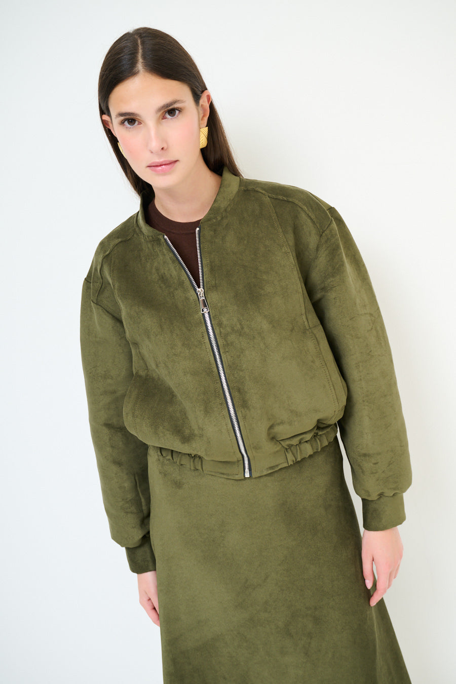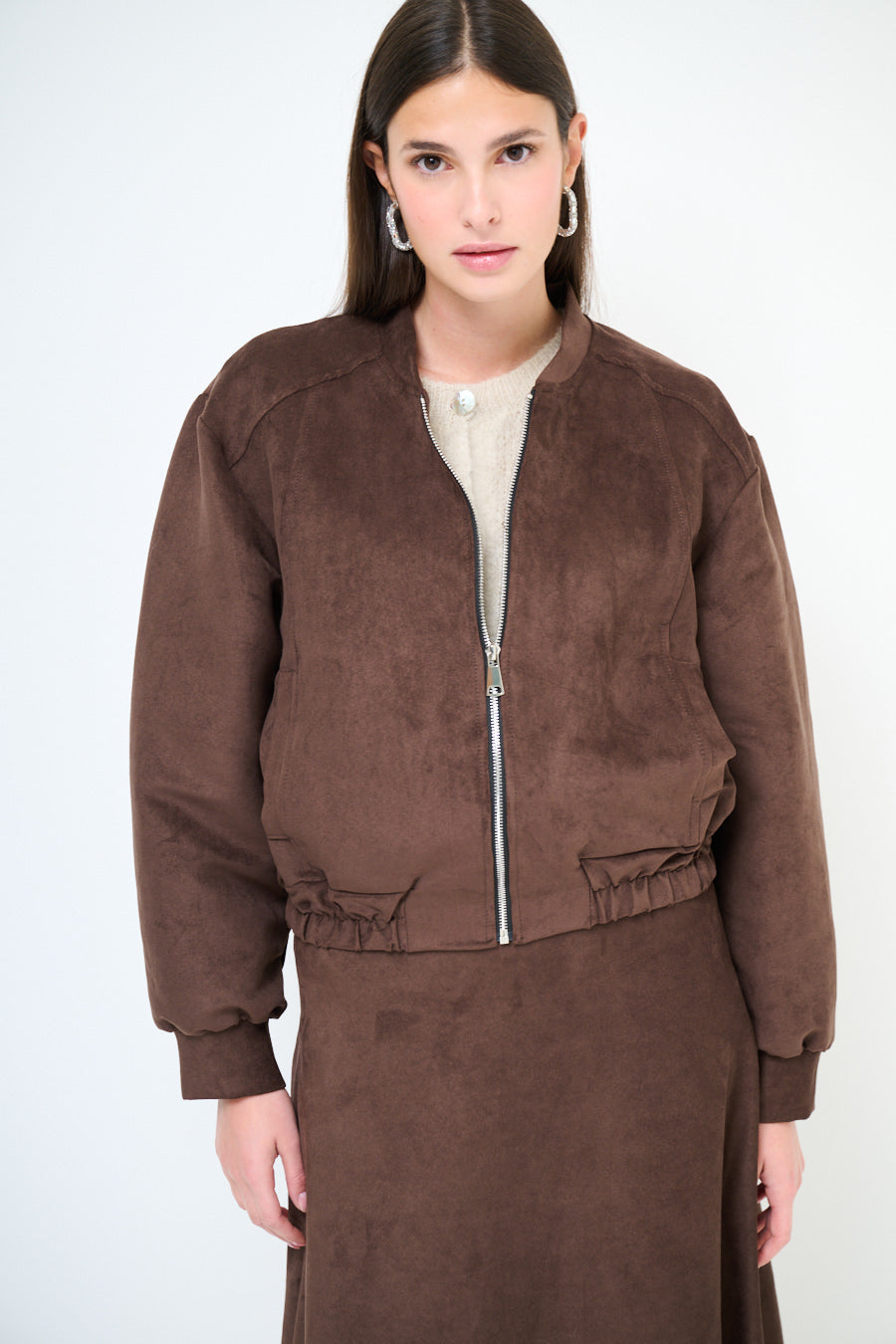 - Bomber-inspired silhouette with a relaxed cropped fit