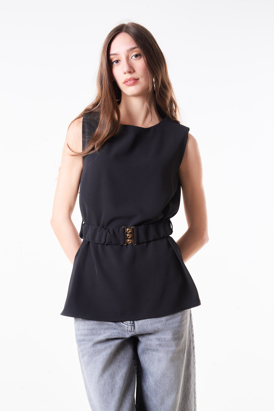 Round neck blouse with adjustable waist belt buckle detail wholesale