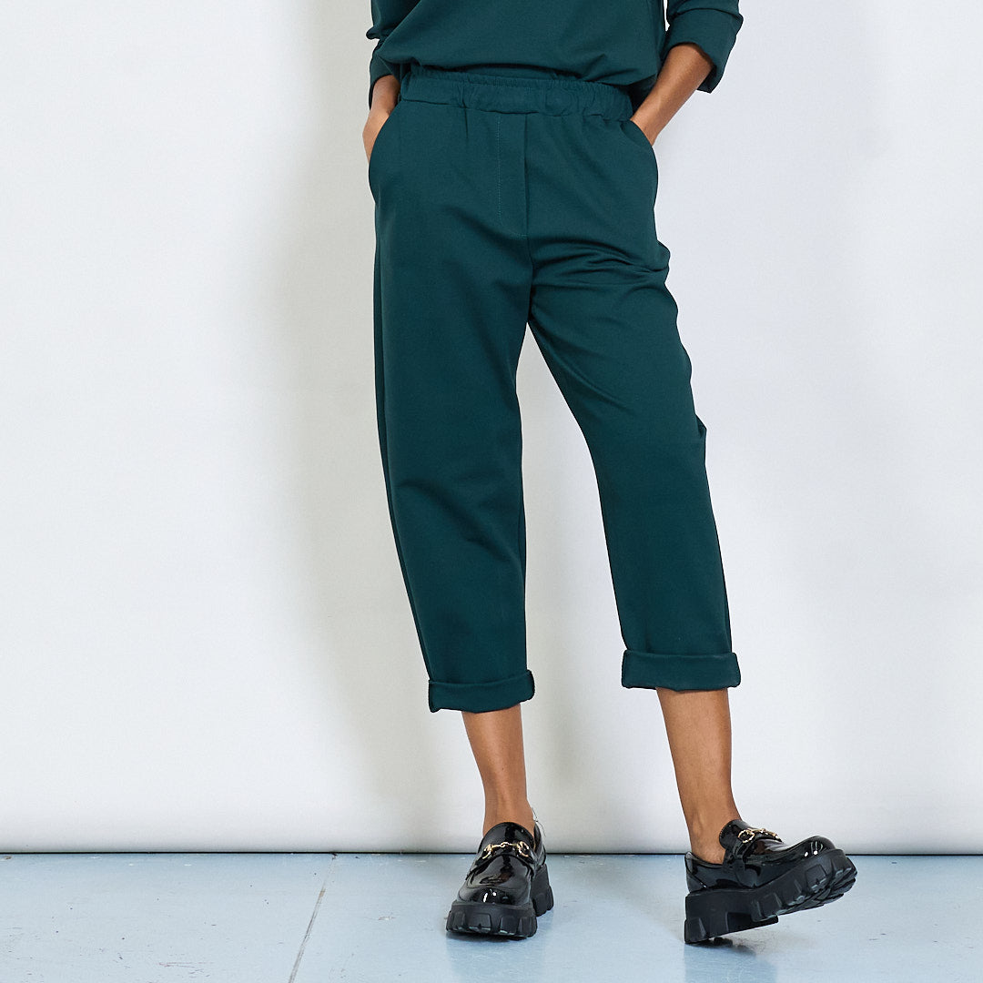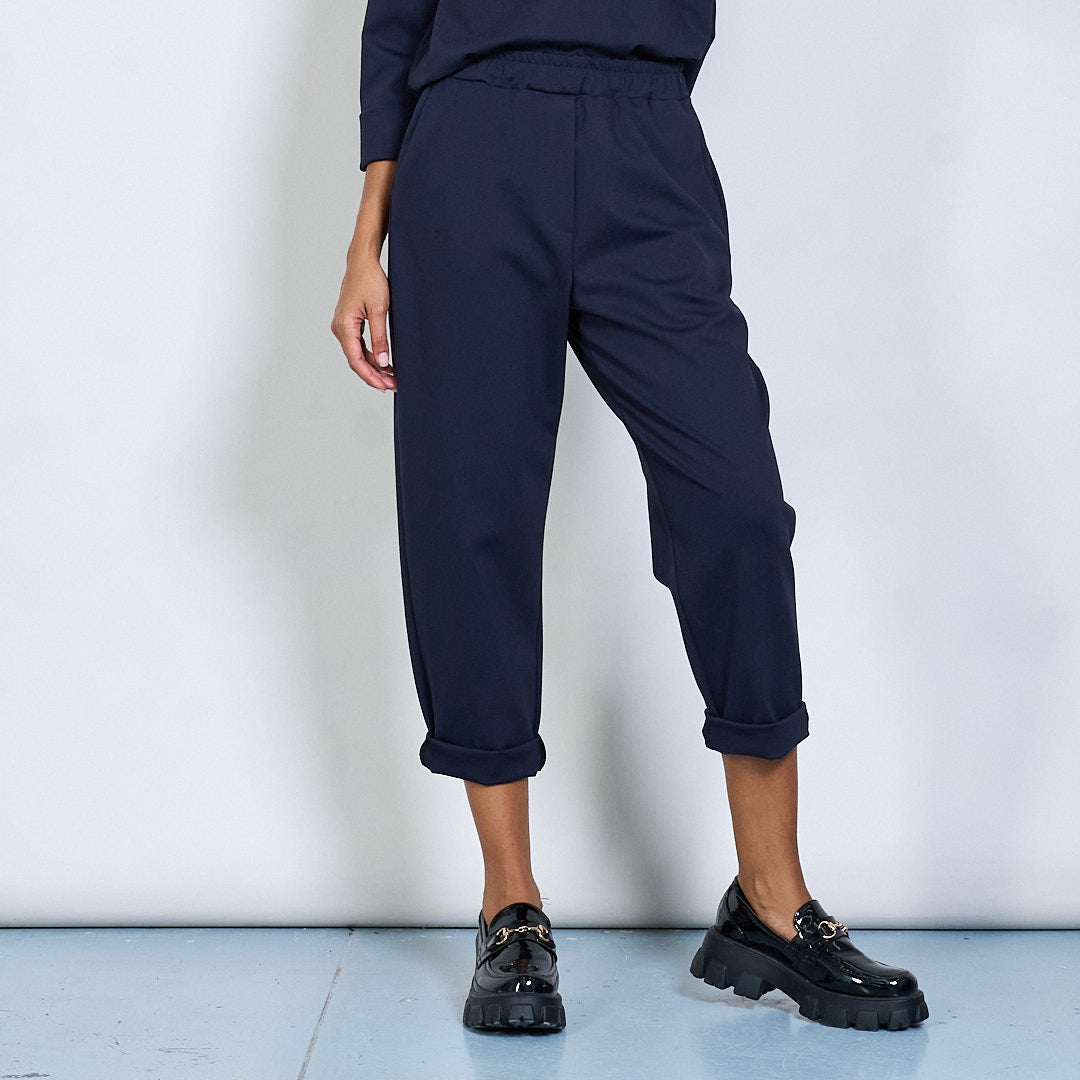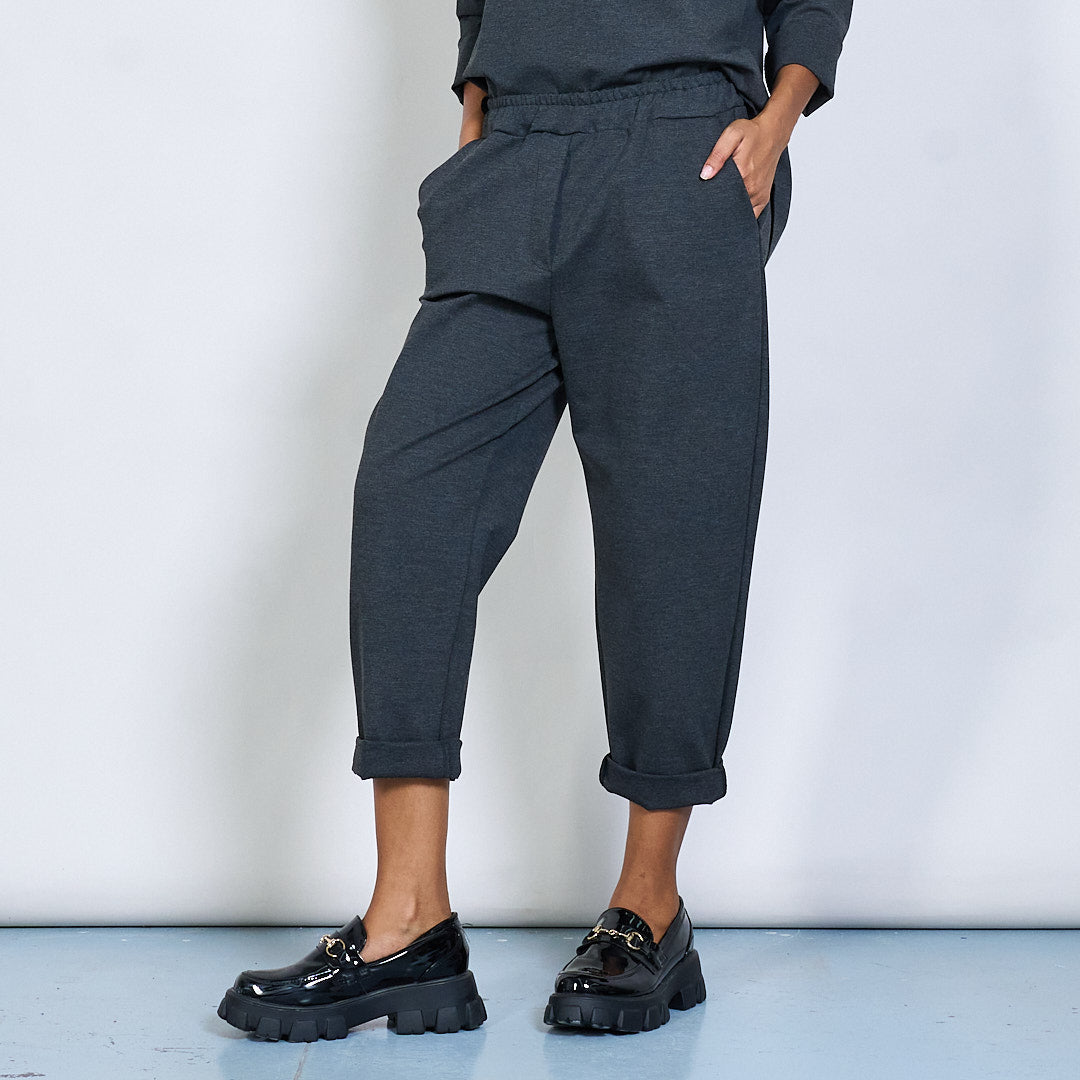 - Tapered leg fit with turned-up hem detail