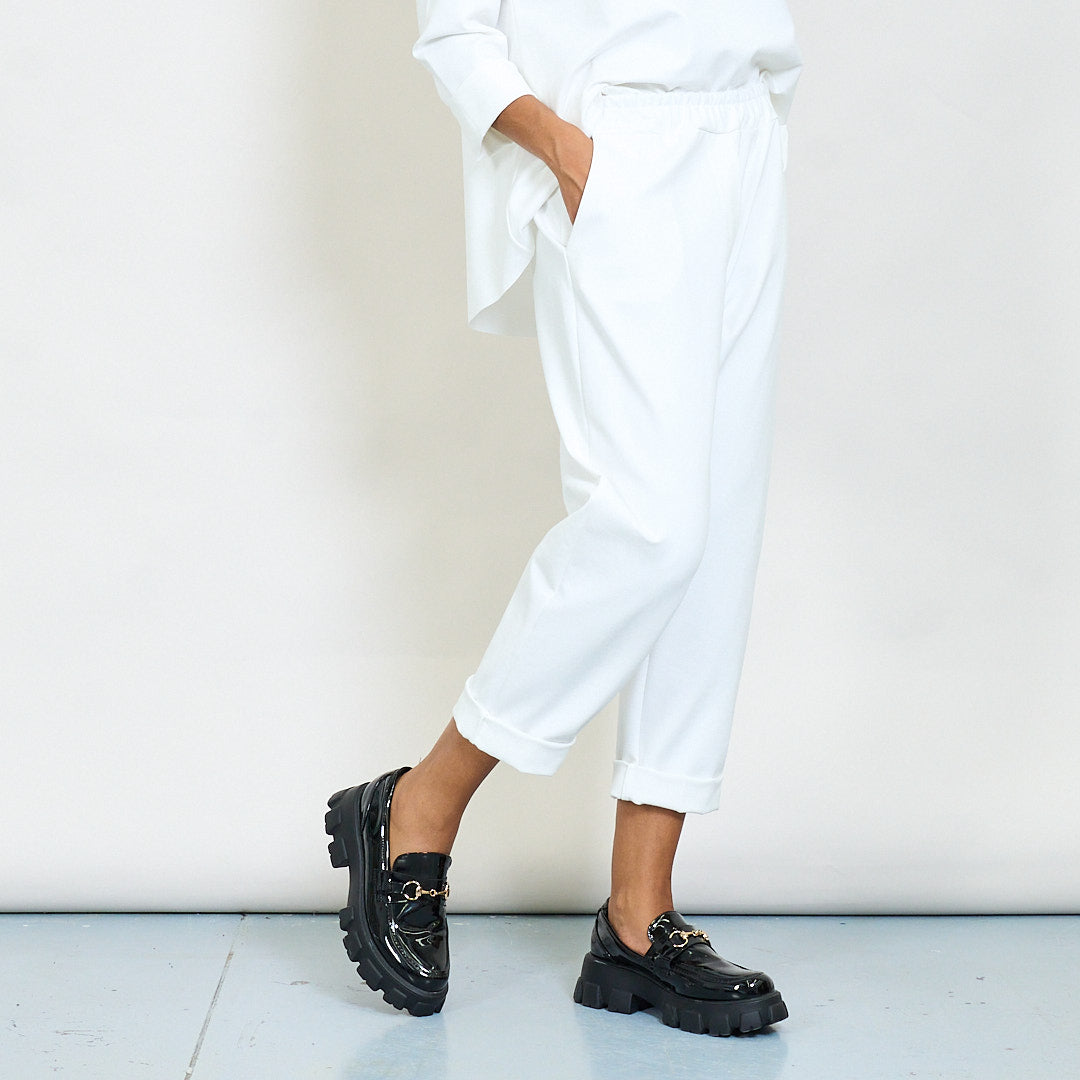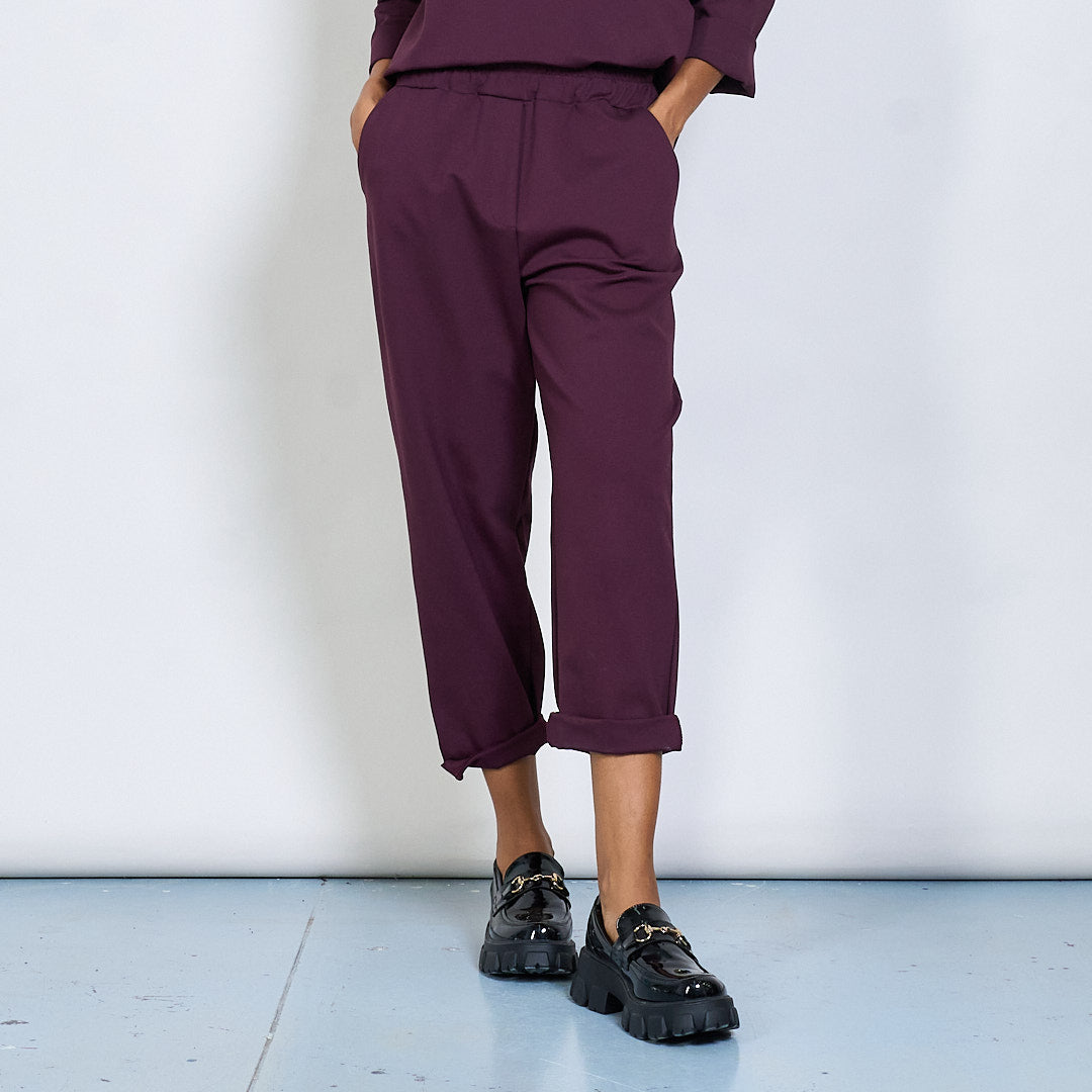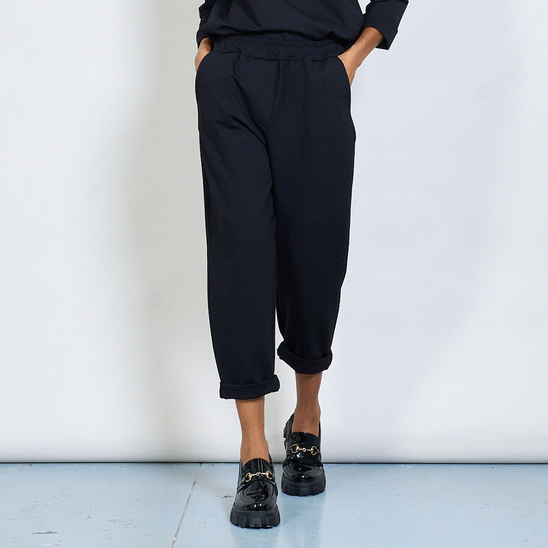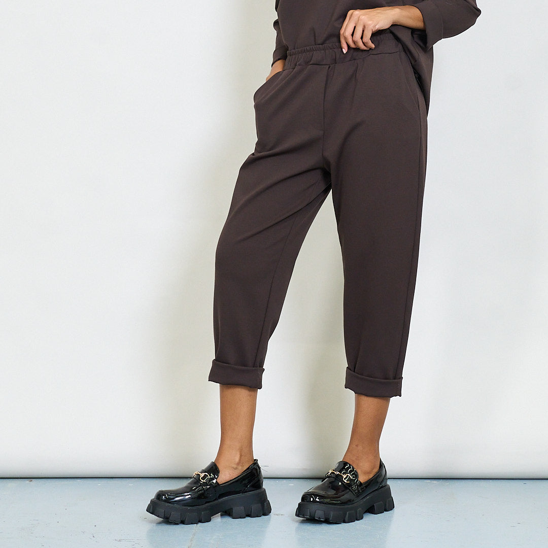 - Tapered leg fit with turned-up hem detail