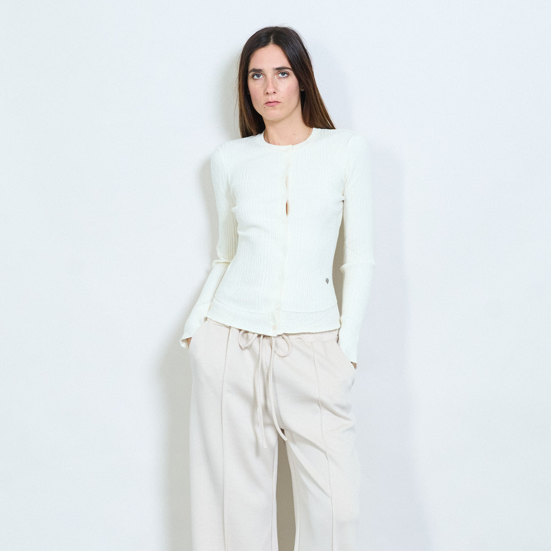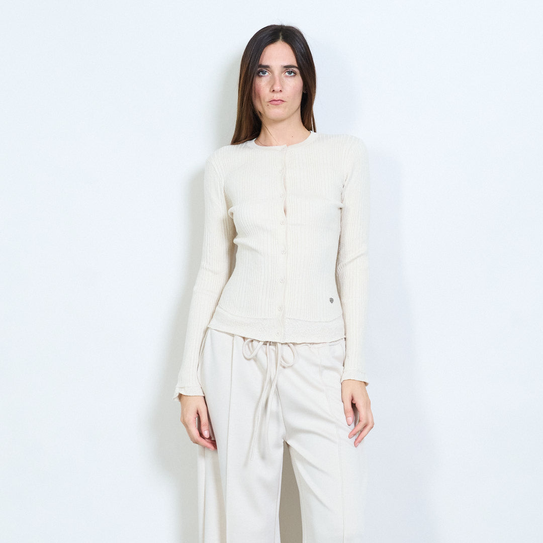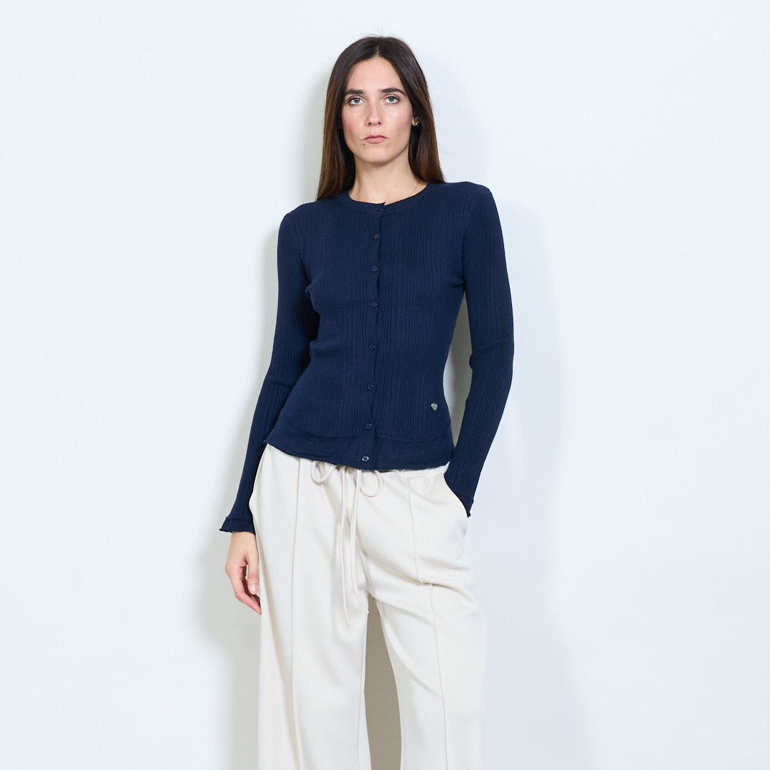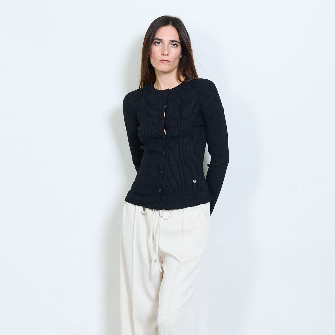 Ribbed knit fitted button-front cardigan with heart emblem wholesale