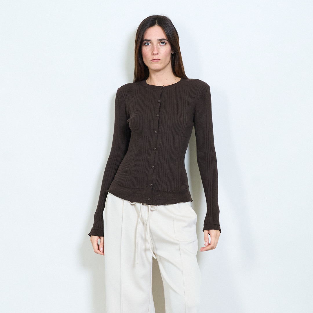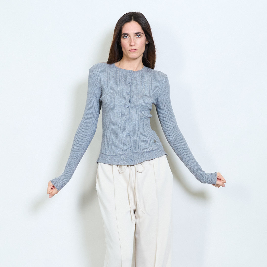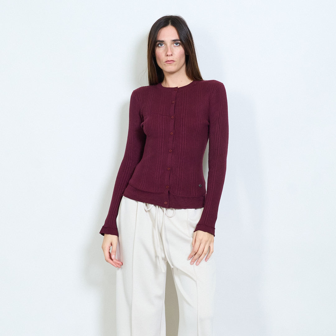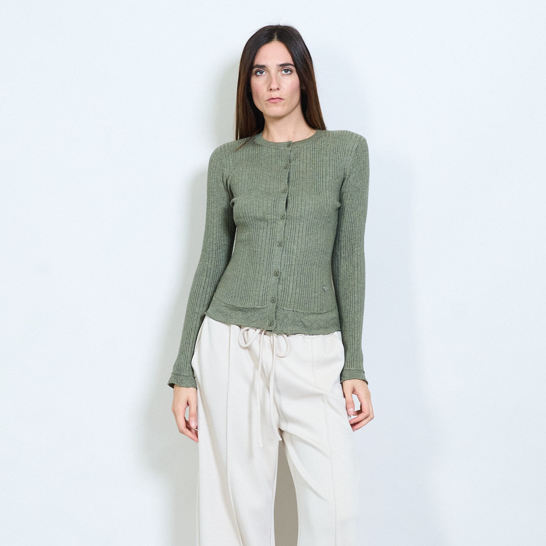 Ribbed knit fitted button-front cardigan with heart emblem wholesale