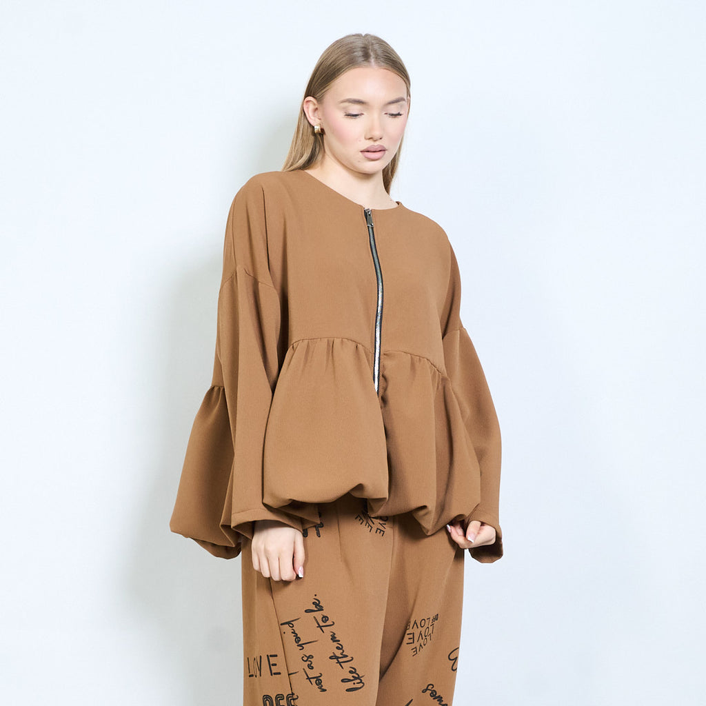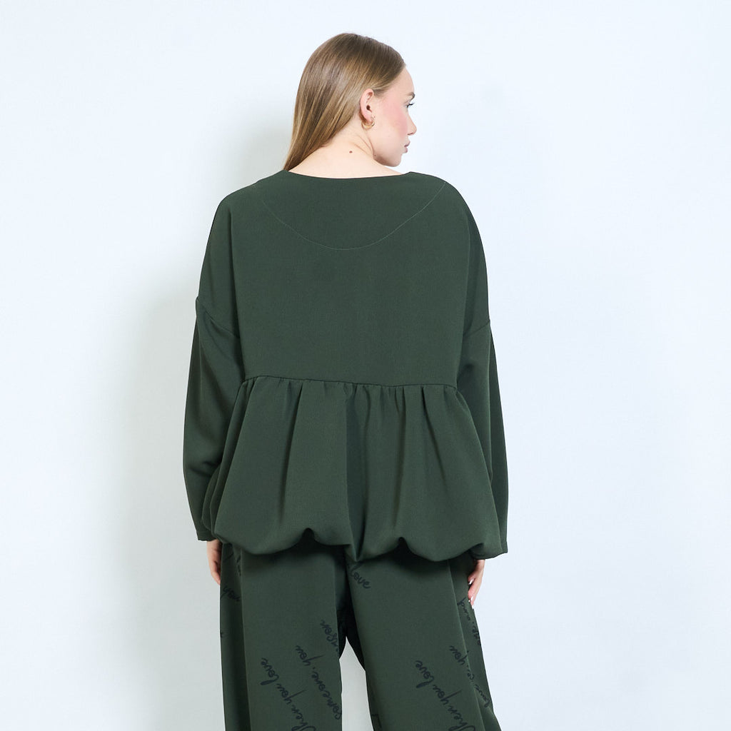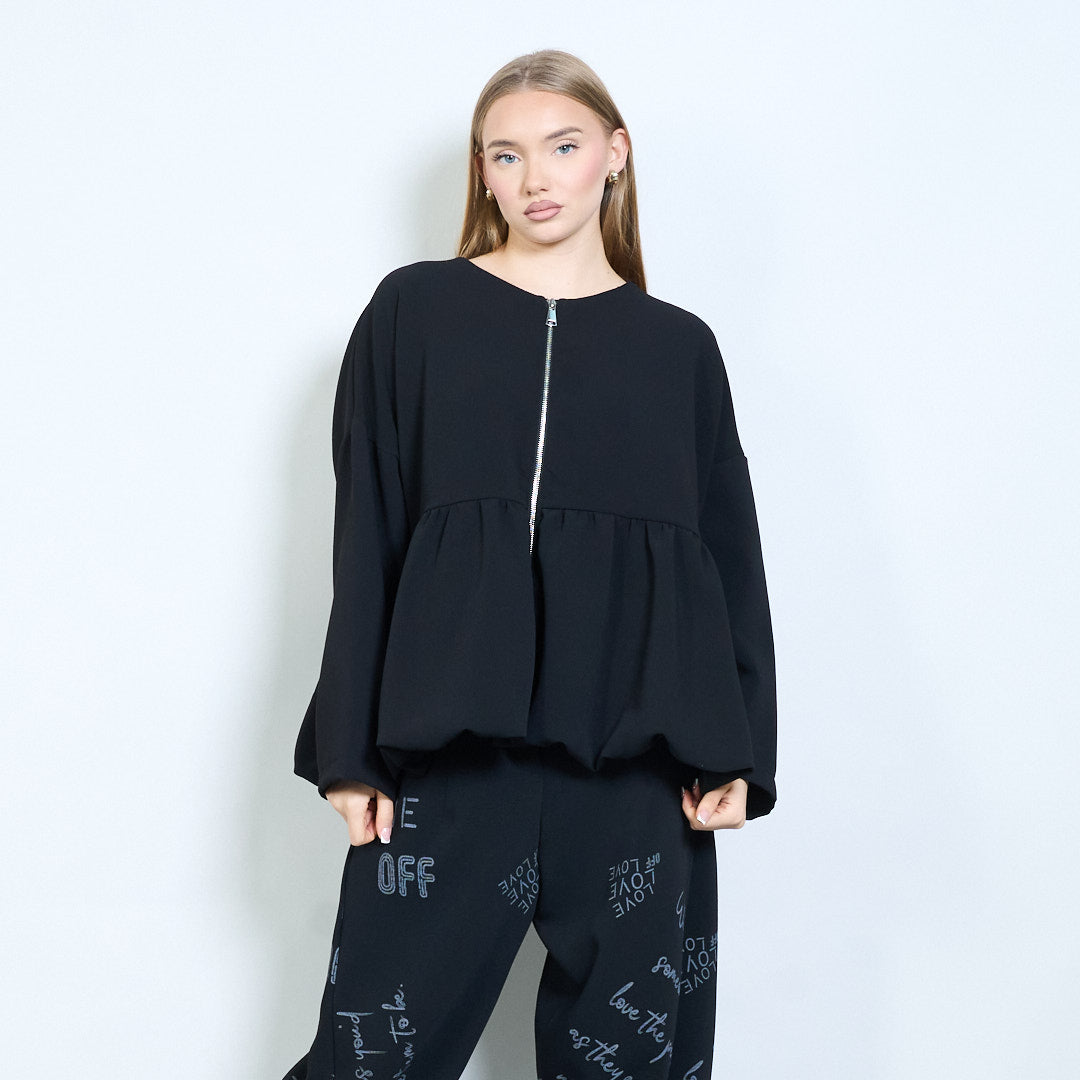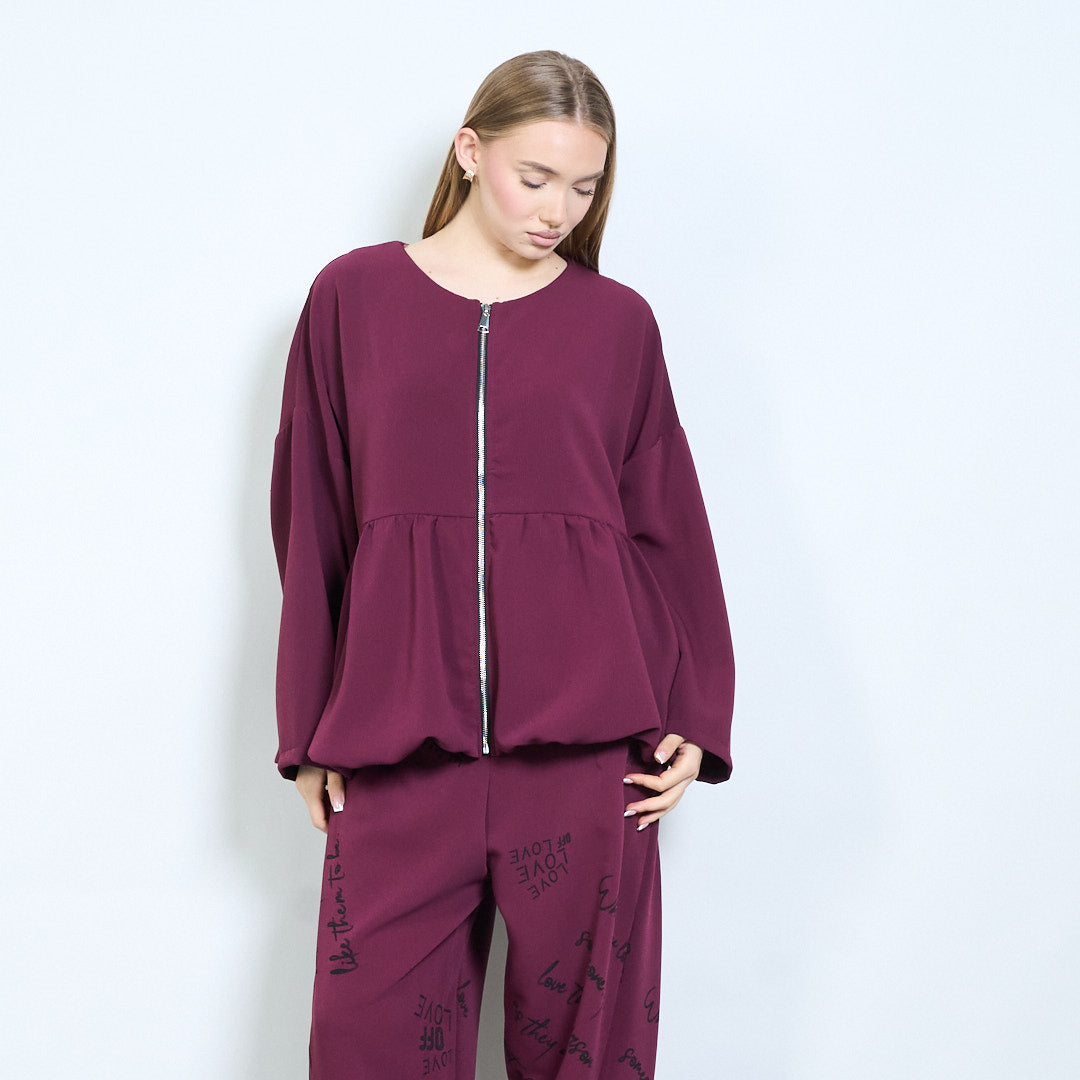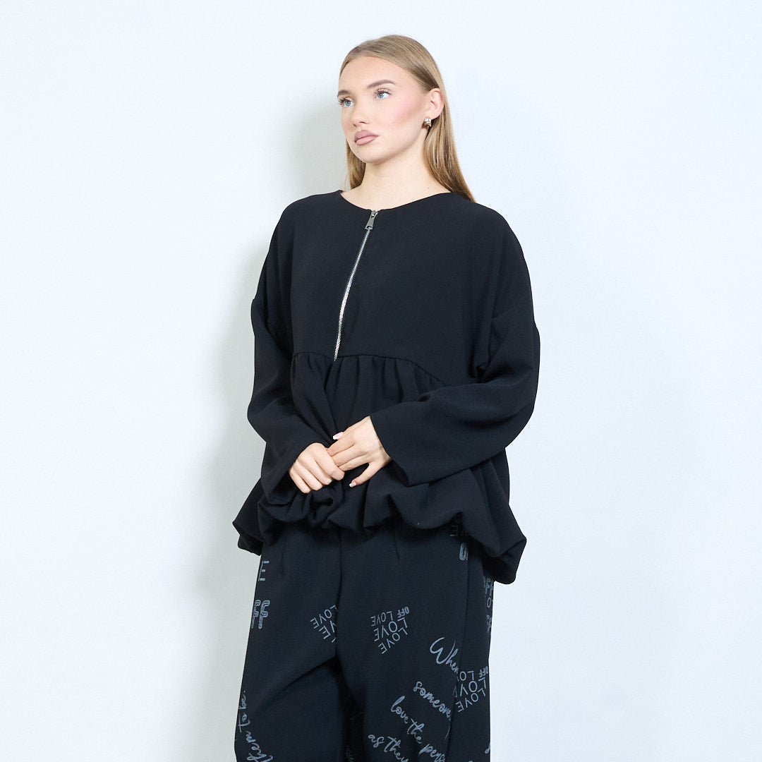 • Designed with a soft pleated peplum that creates a gentle flared silhouette