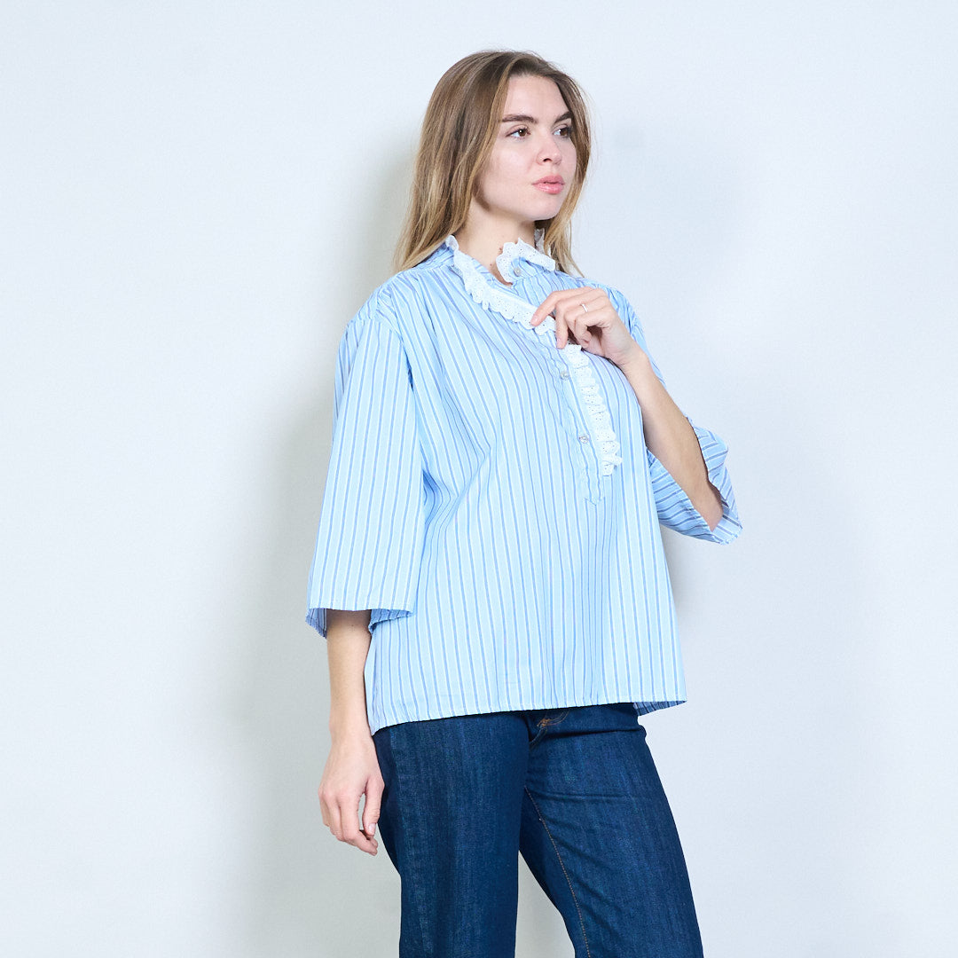 Stribet blonde flæse stativ krave bluse engros