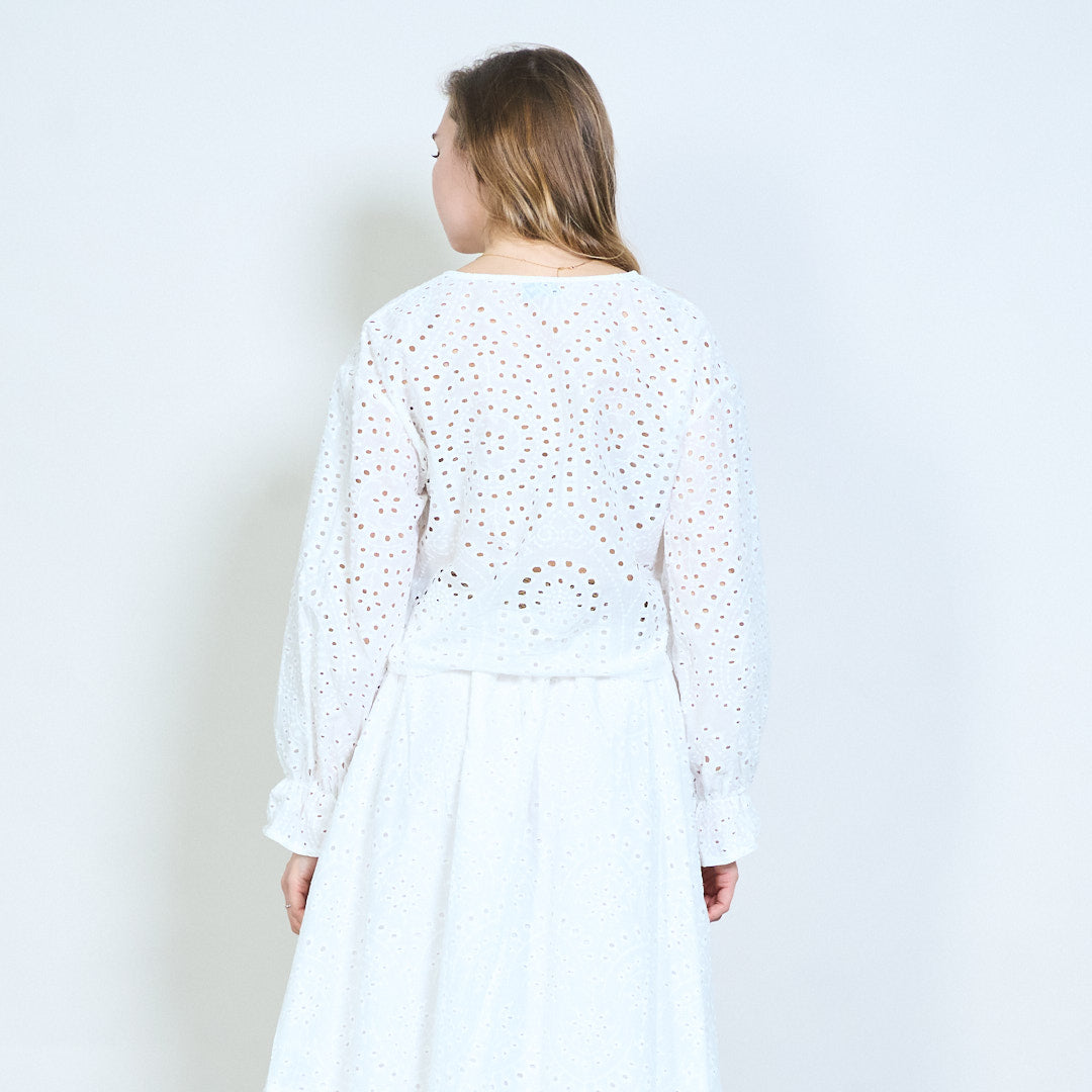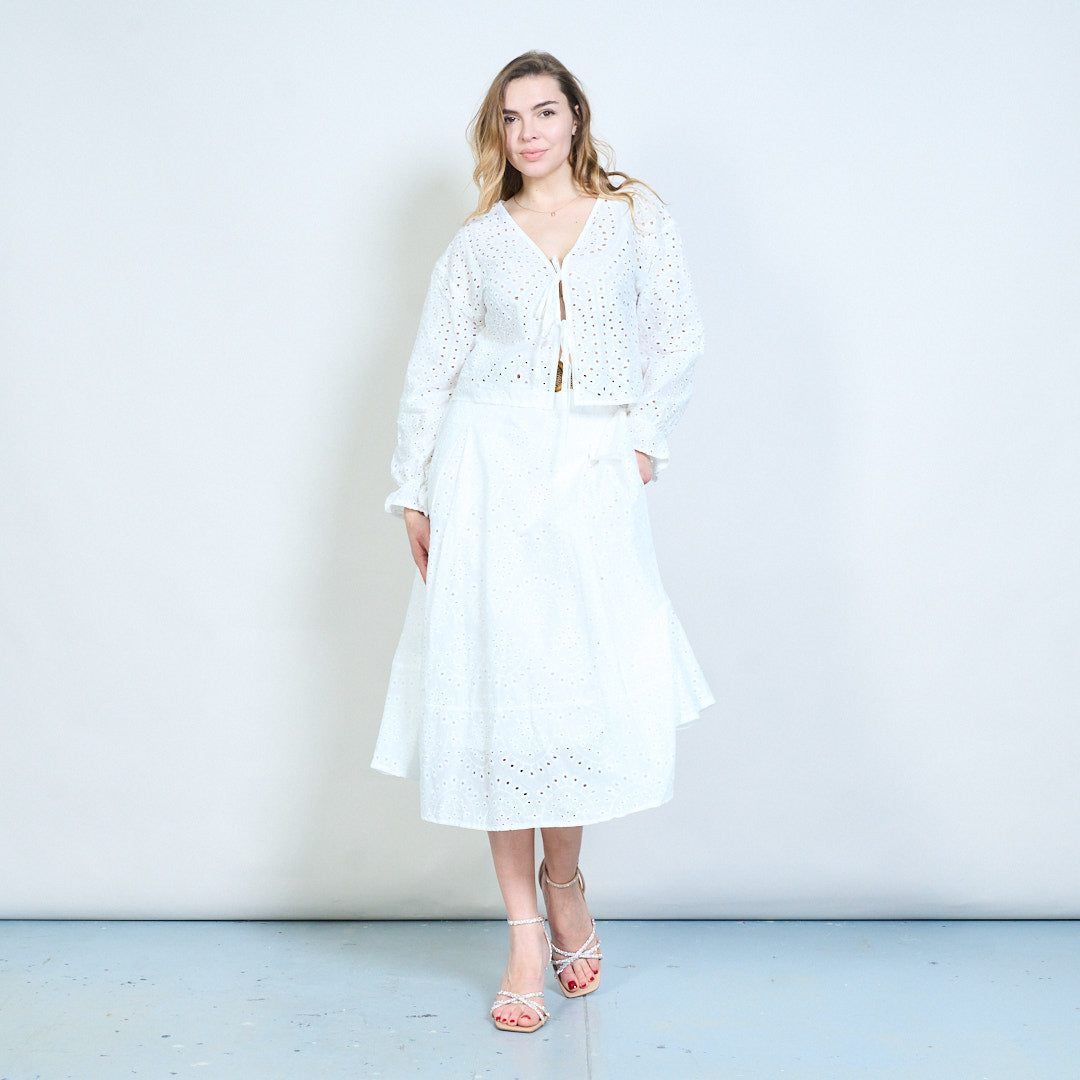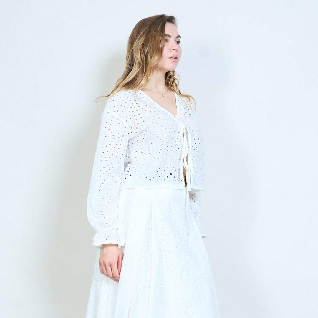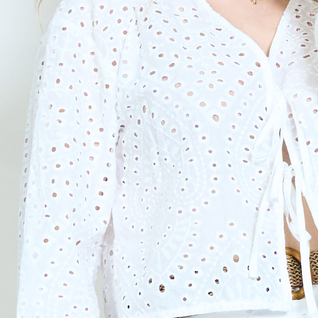 Blomsterbroderet v-udskæring foran bindebåndsbluse med blød struktur og lange ærmer engros