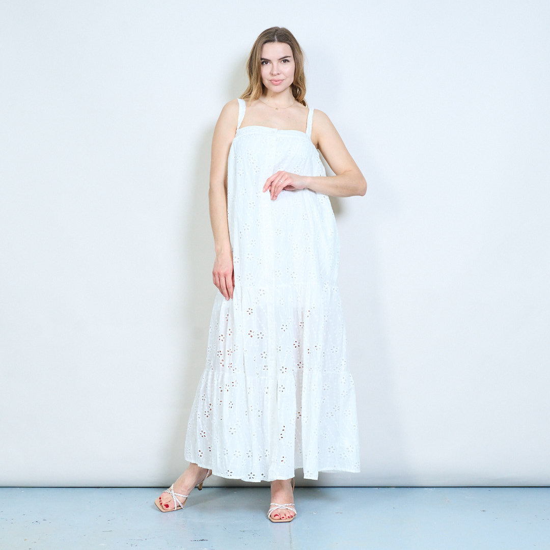 Midikjole med knap-detaljeret øje med skulderstropper og nederdel i niveauer engros