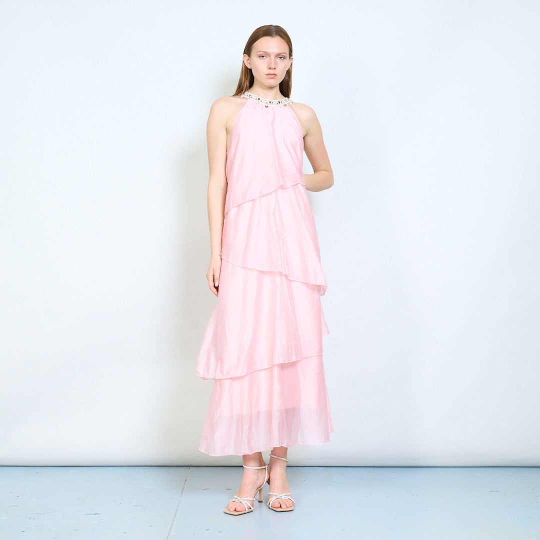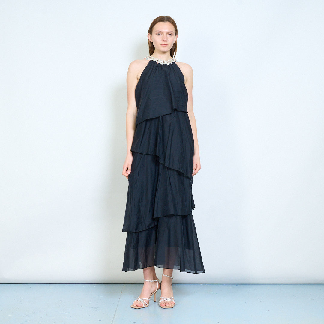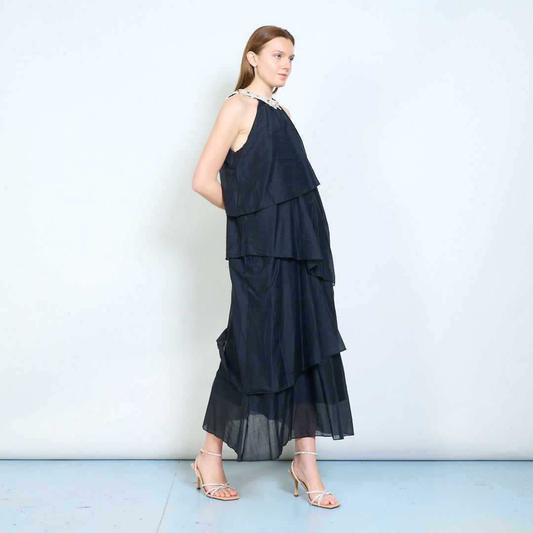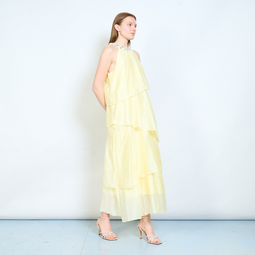 Lagdelt flydende udsmykket halsudskæring ærmeløs lang kjole engros