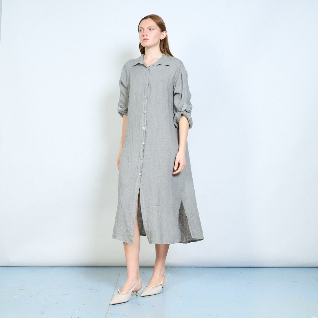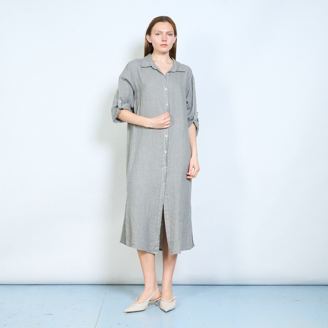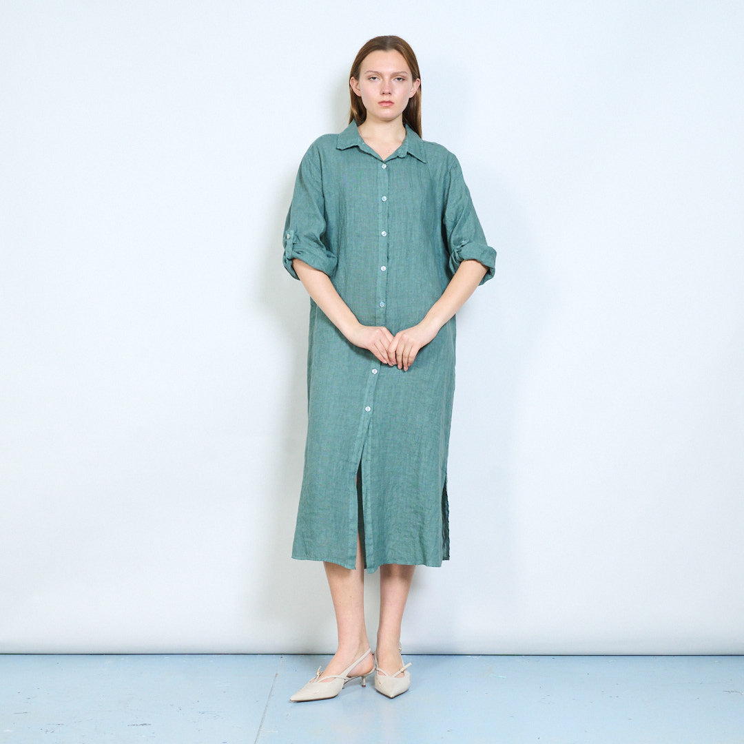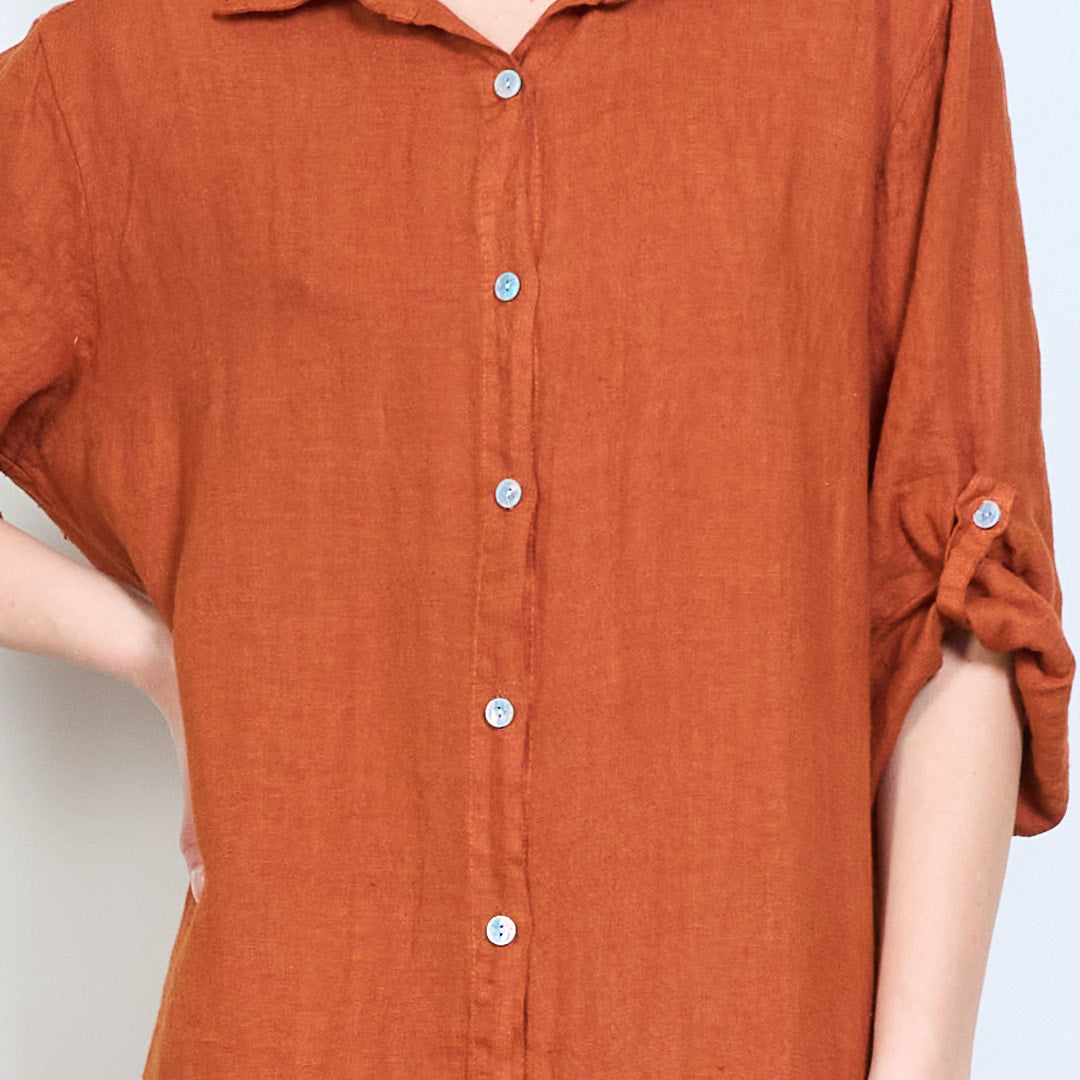 Lang skjorte i blød draperet hør med oprulningsærmer engros