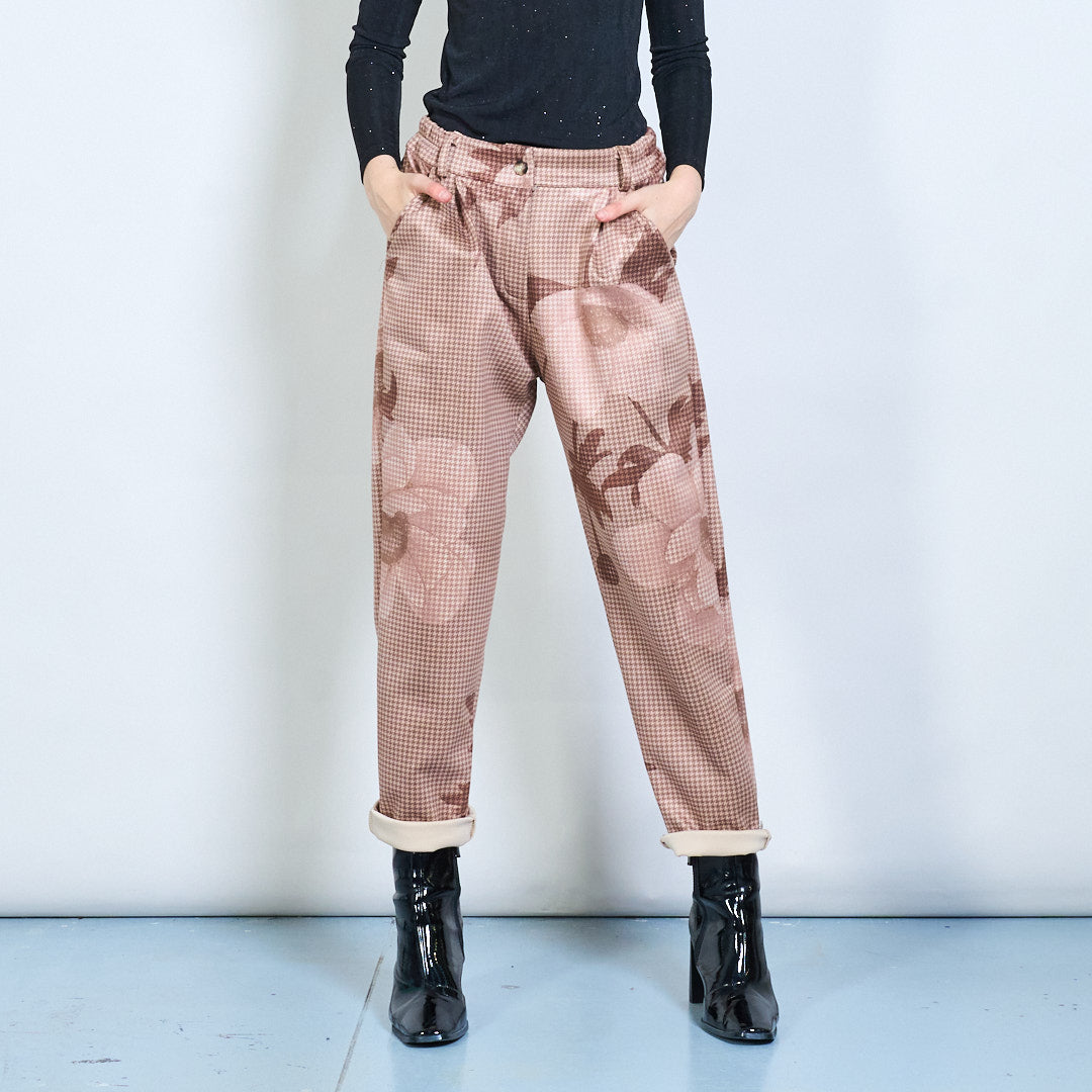 - Elegant fusion af dristige blomsterprint med klassisk houndstooth -mønster