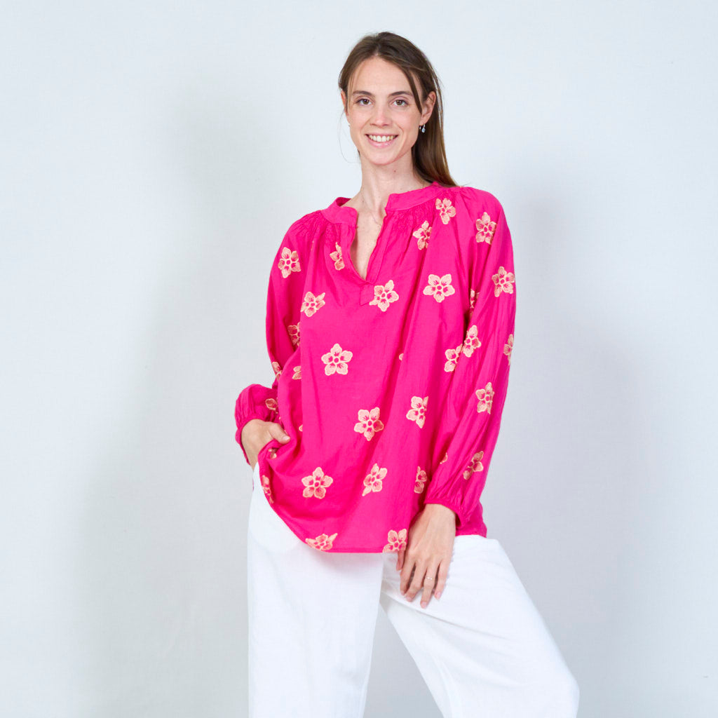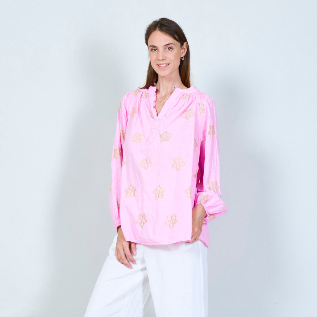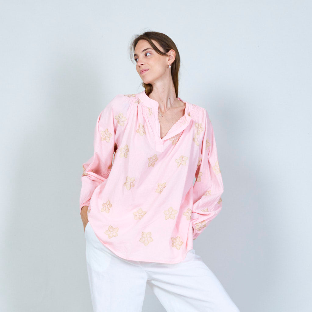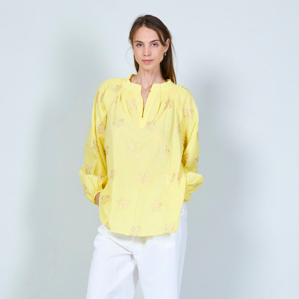 Blomsterbroderet tunika med smocked halsudskæring engros
