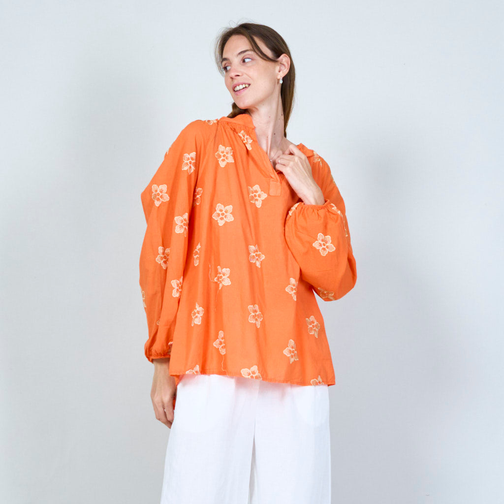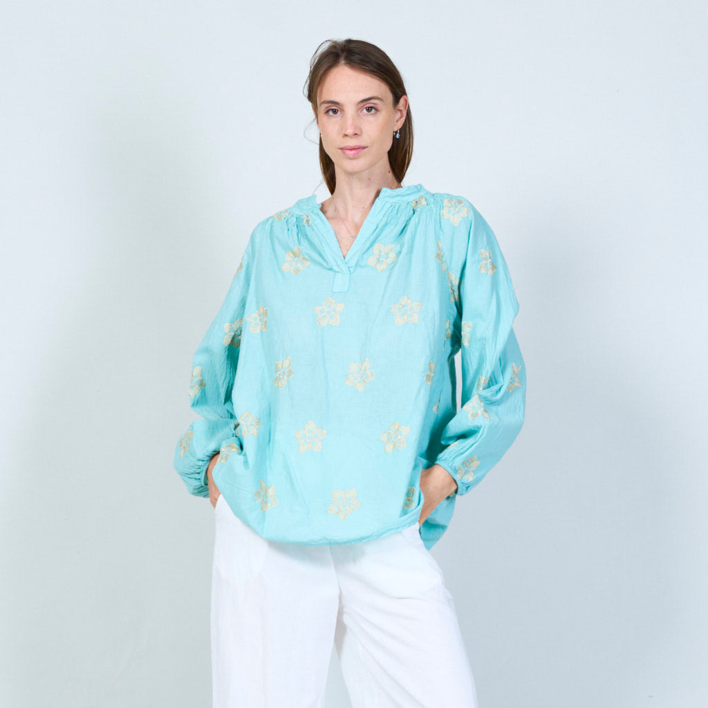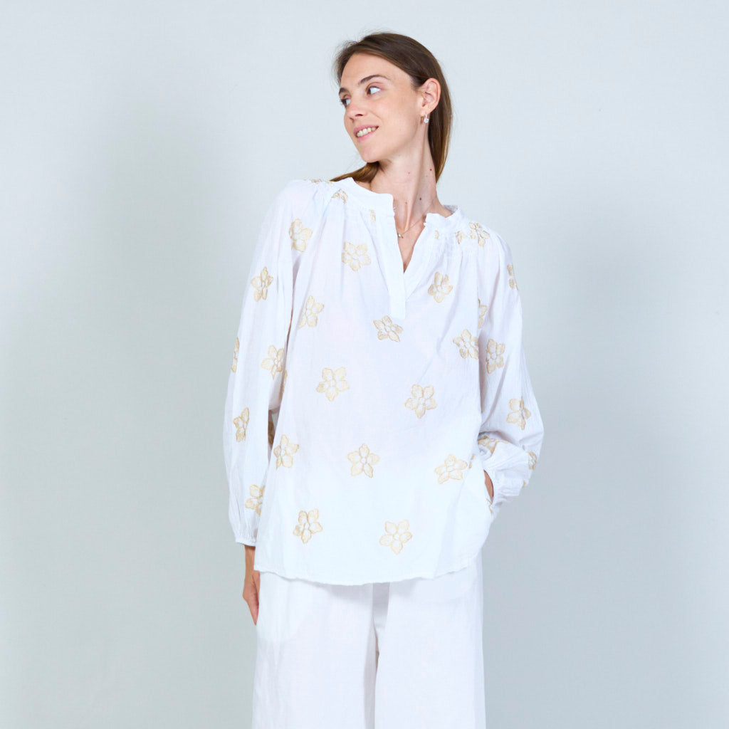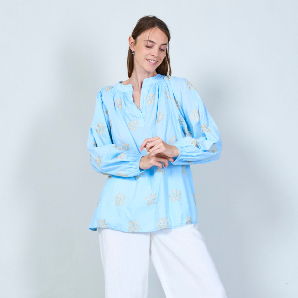Blomsterbroderet tunika med smocked halsudskæring engros