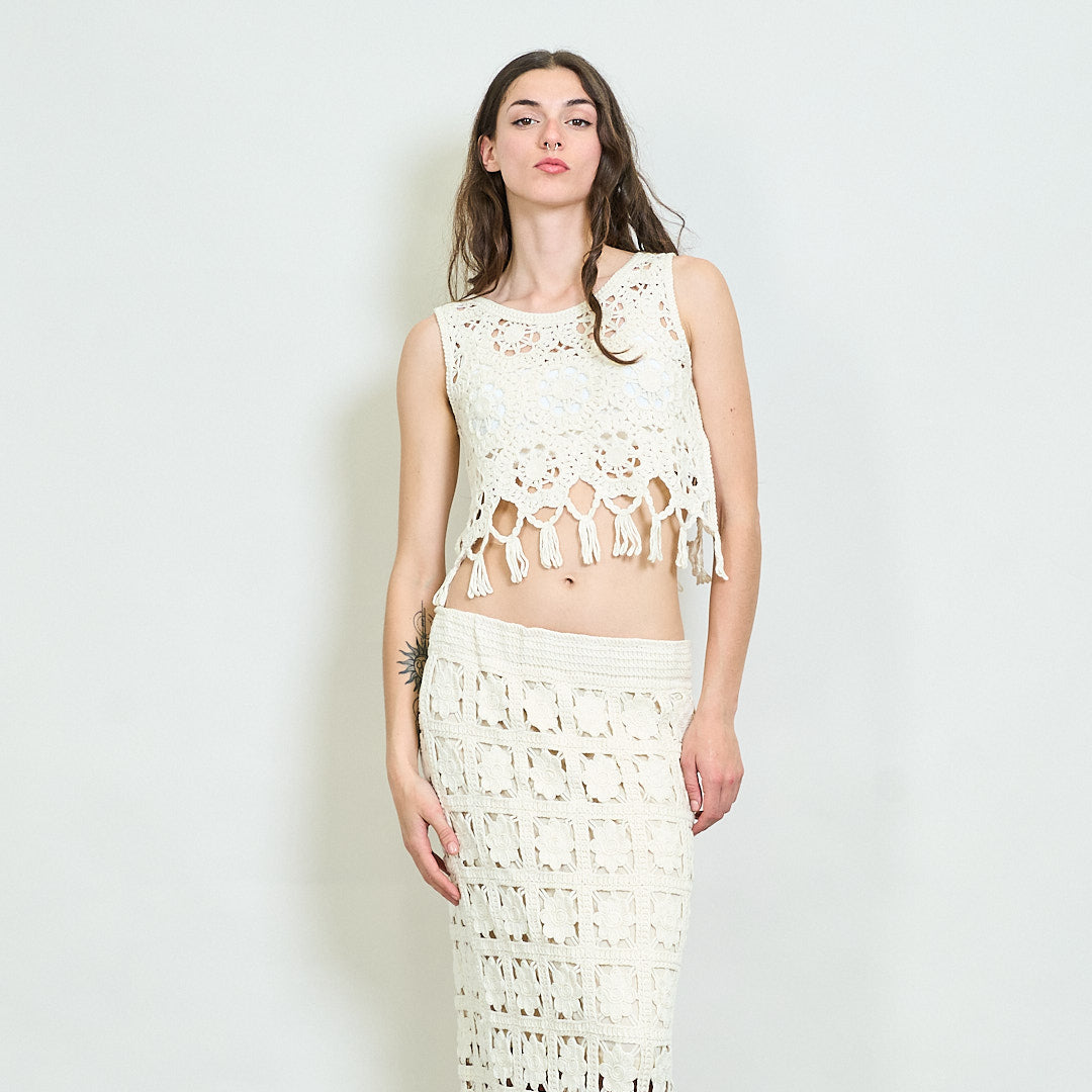 Blomsterhæklet ærmeløs afgrøde top med kvast hem engros
