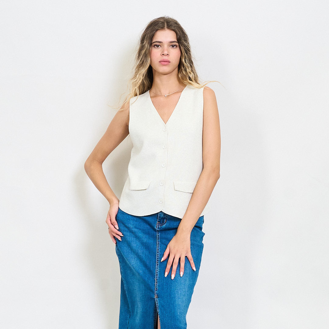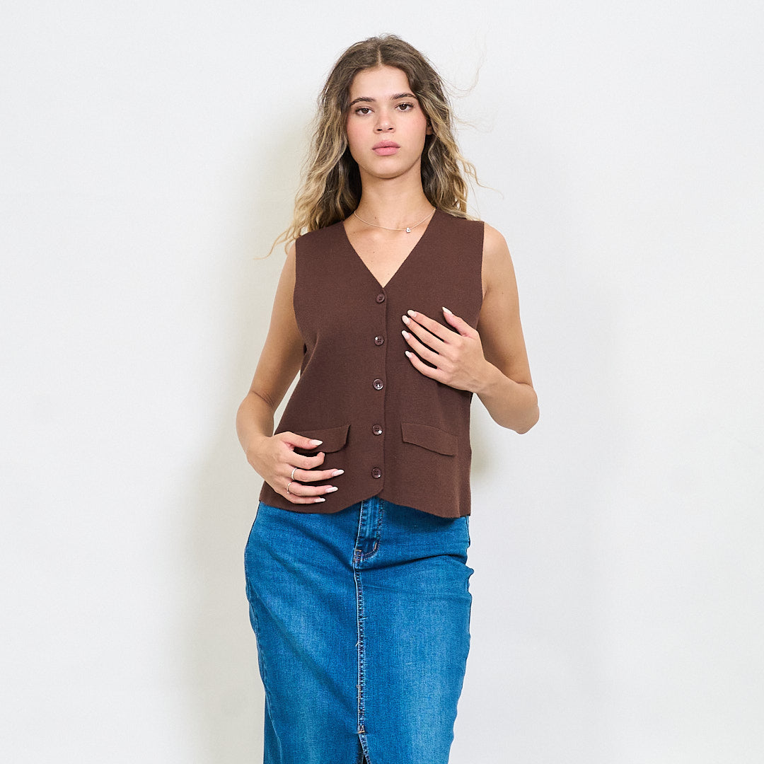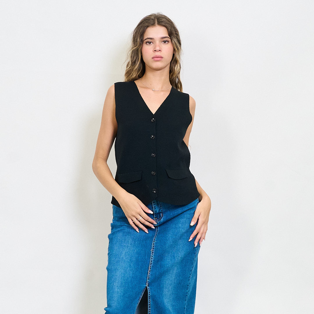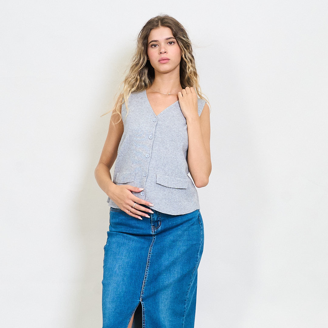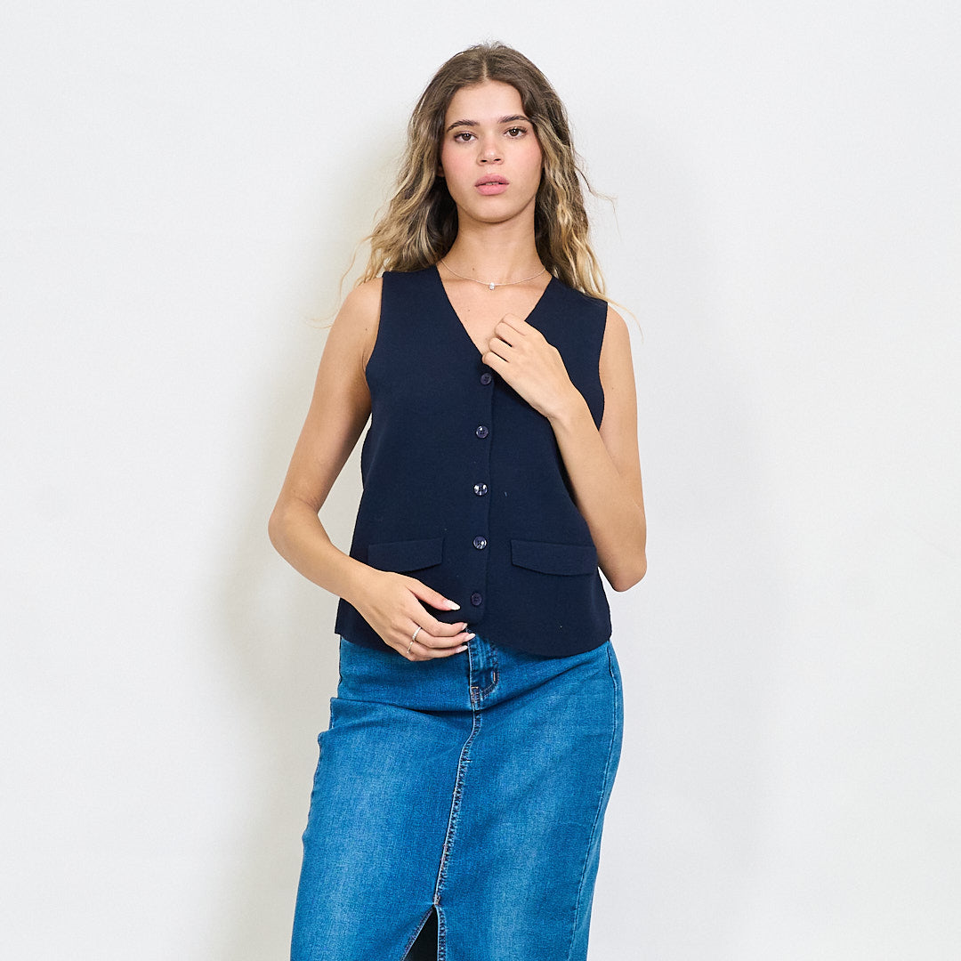 Minimalistisk skræddersyet strikket vest med faux lomme detaljer engros