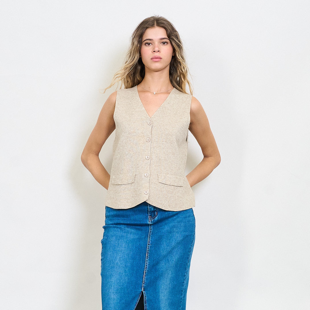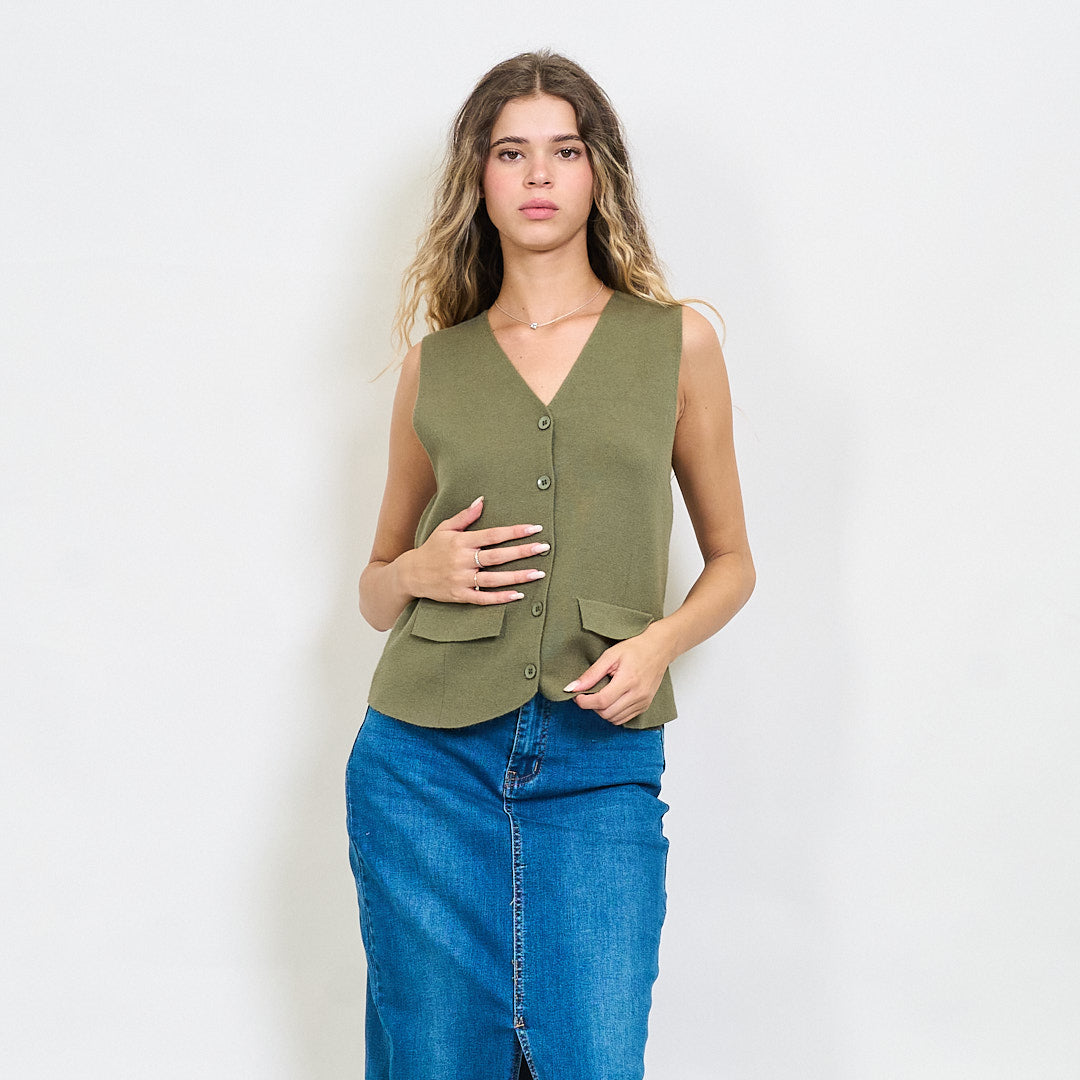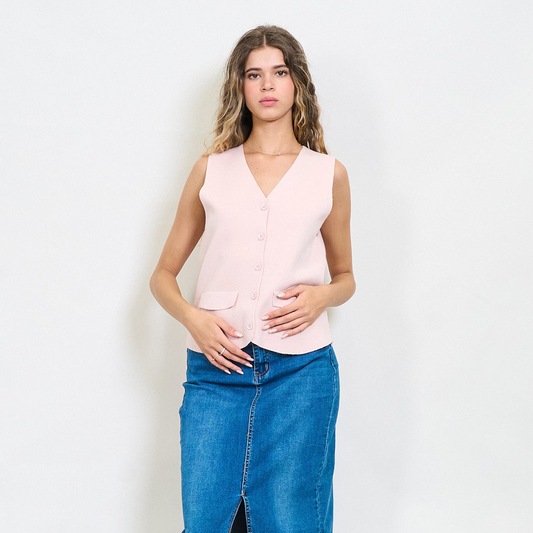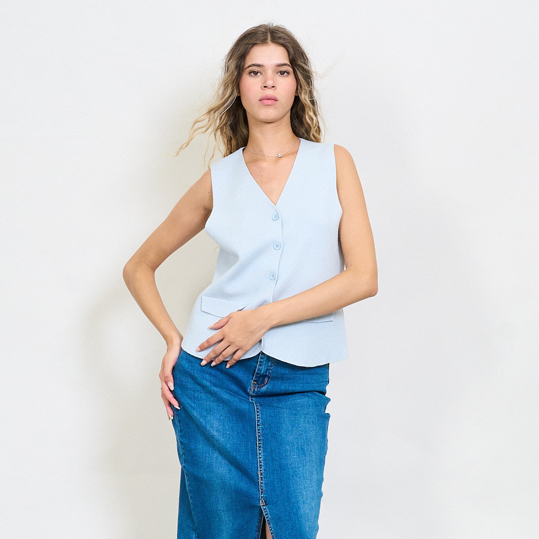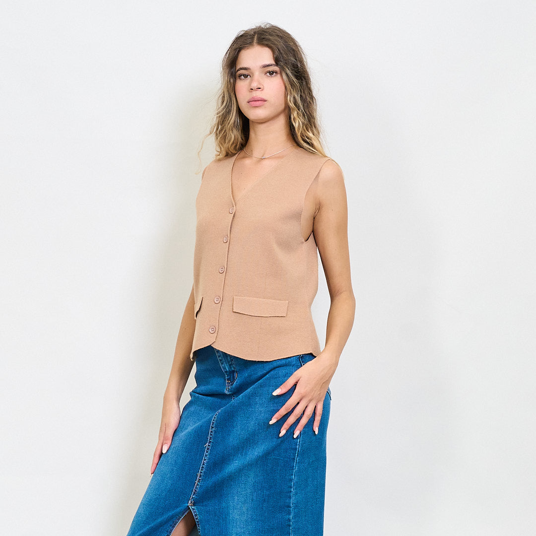 Minimalistisk skræddersyet strikket vest med faux lomme detaljer engros