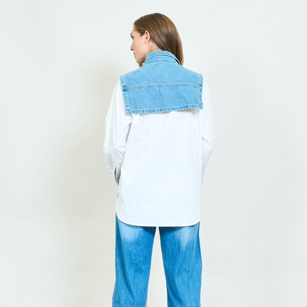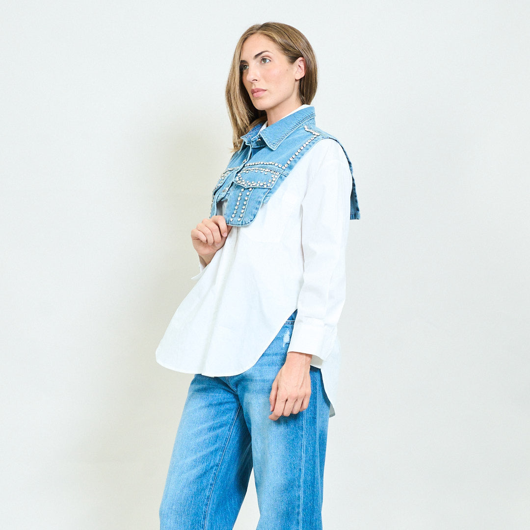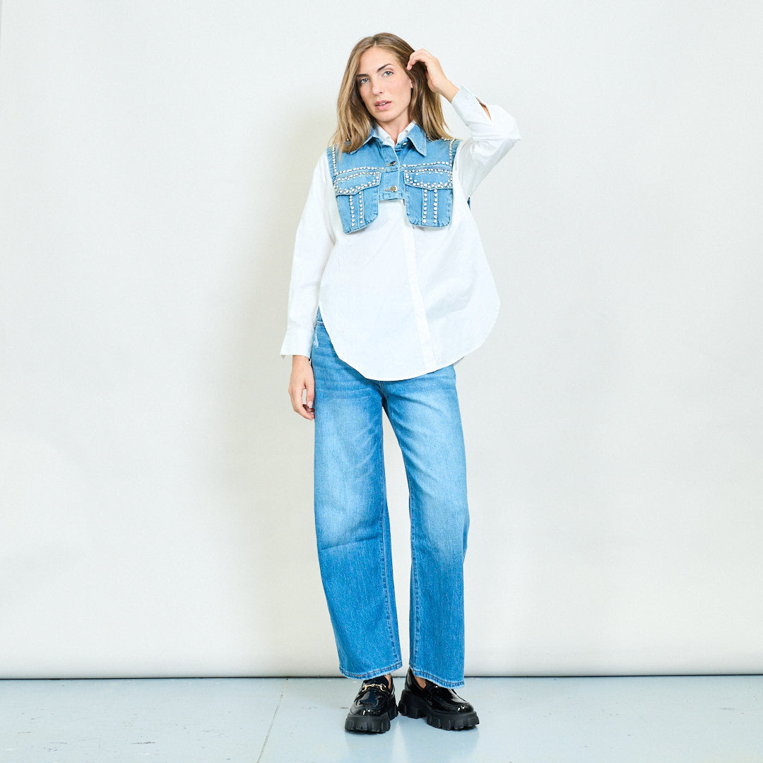 Rhinestone Denim Vest Layered Blouse Shirt Engros