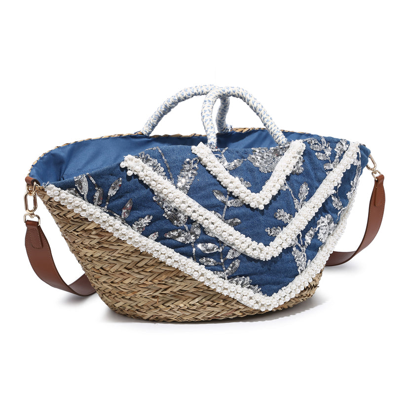 V-mønster Pearl Trim Floral Sequin Broderet denimstrå engros