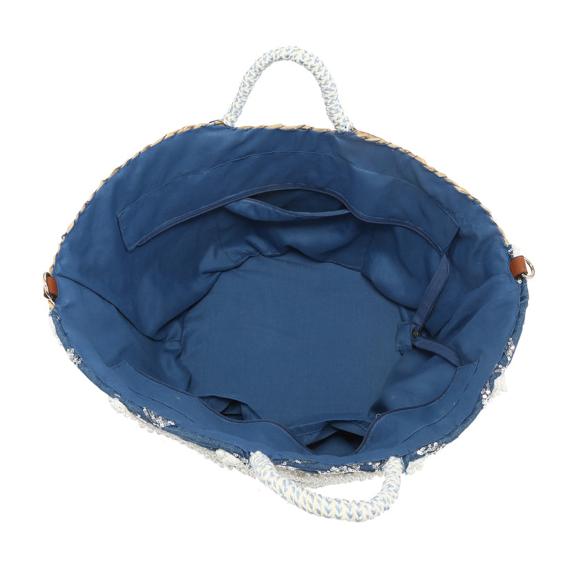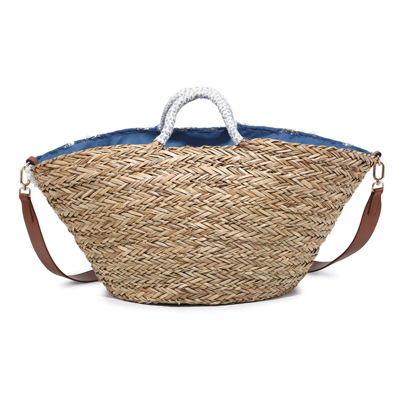 - Denim-tekstureret stof lagdelt over struktureret halmbase