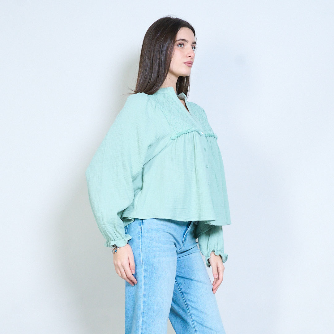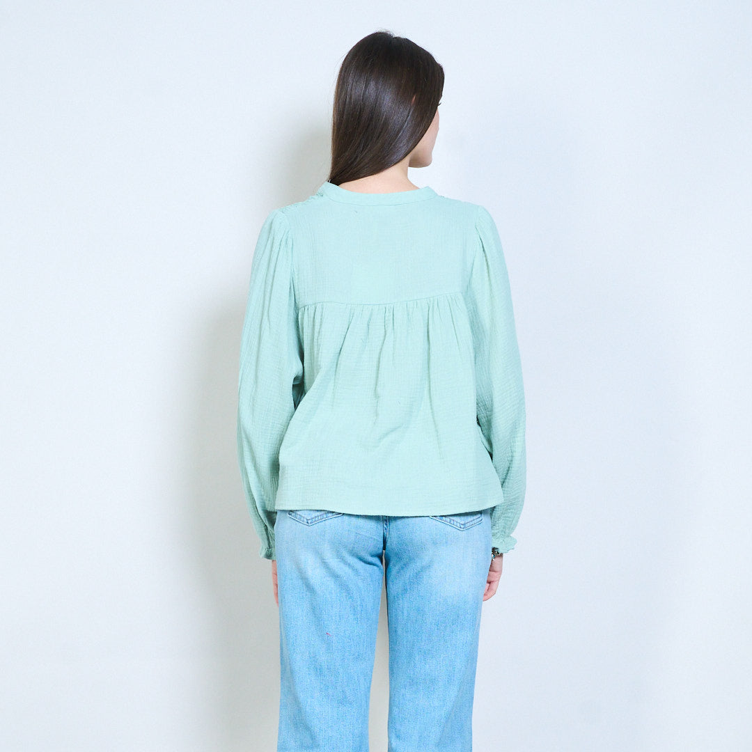 - Lange ærmer med bløde rynkede manchetter skaber en raffineret finish