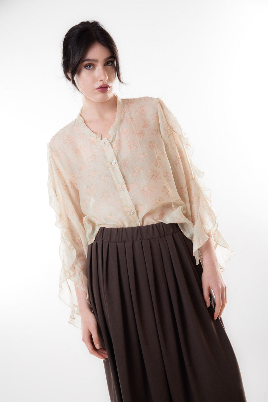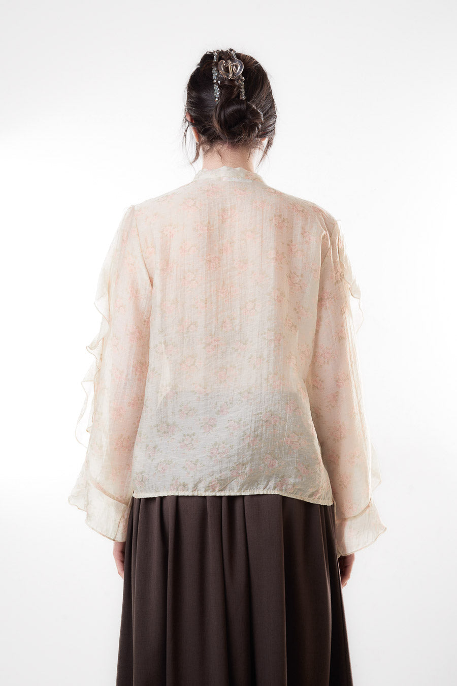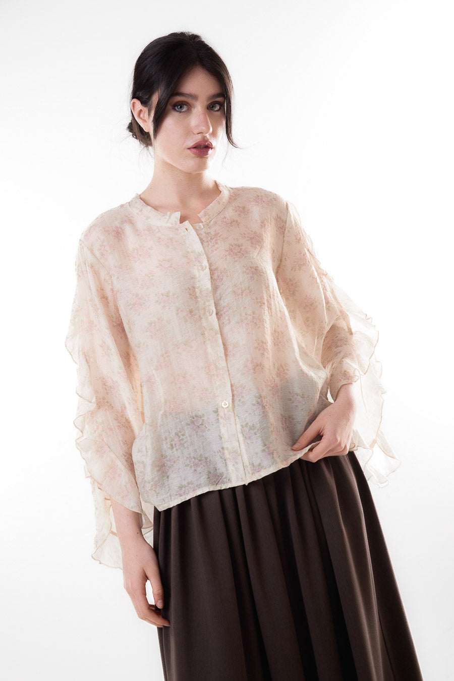 Blomstret gennemsigtigt flæseærme letvægtsbluse engros