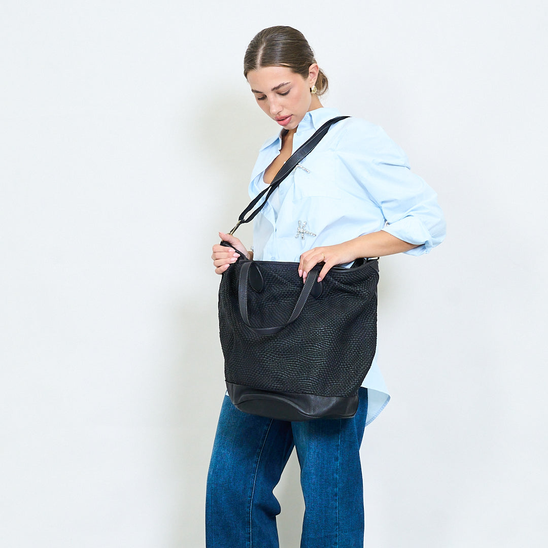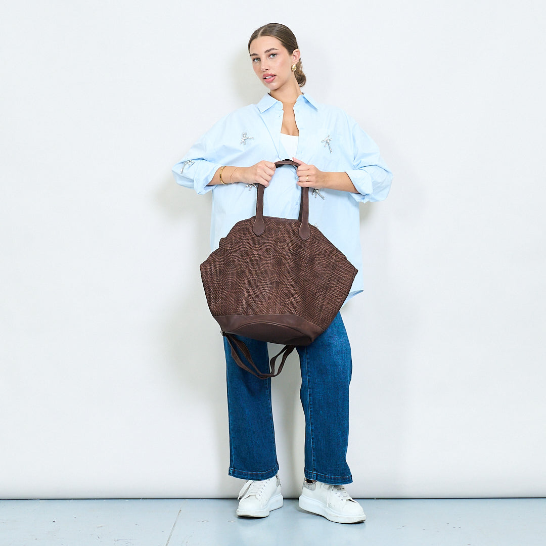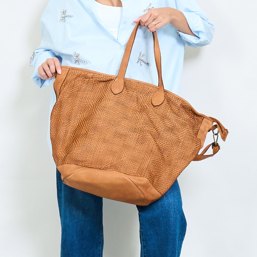 Overdimensioneret vævet læder shopper taske med rund base engros