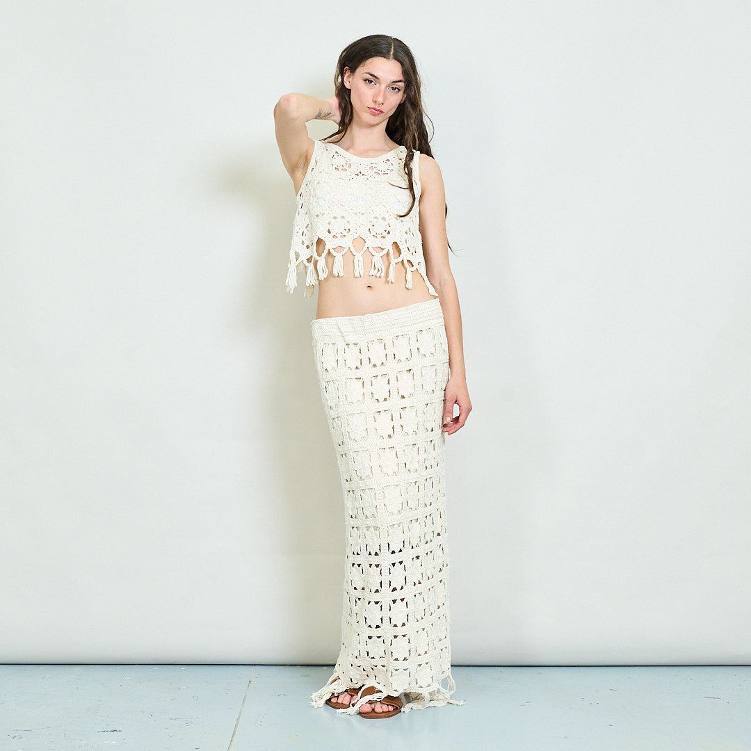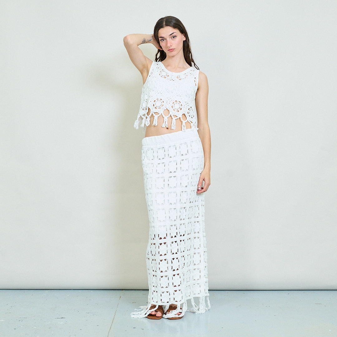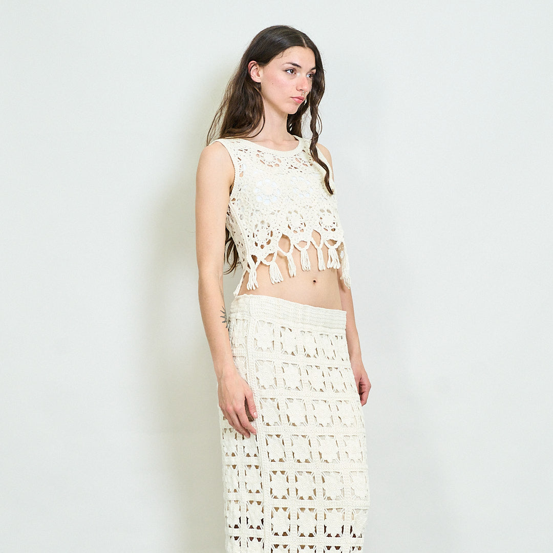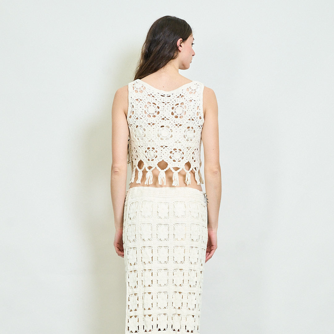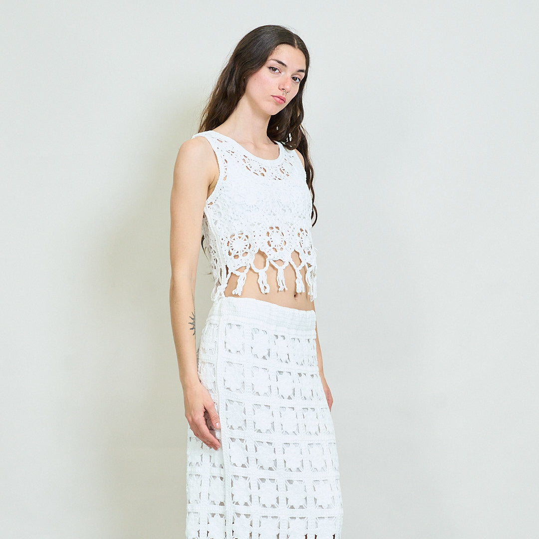 Blomsterhæklet ærmeløs afgrøde top med kvast hem engros