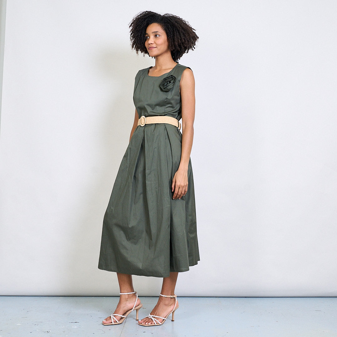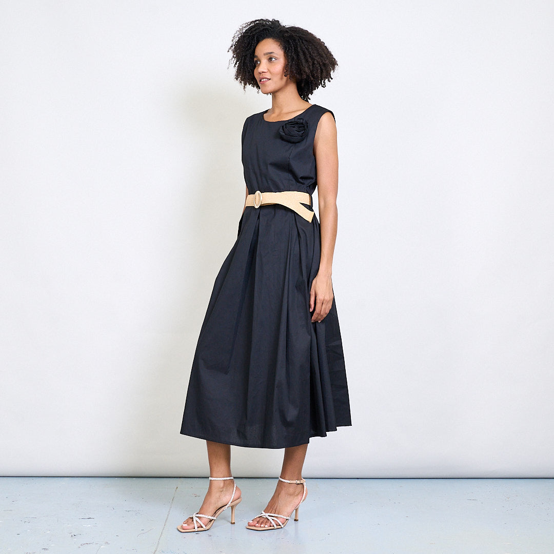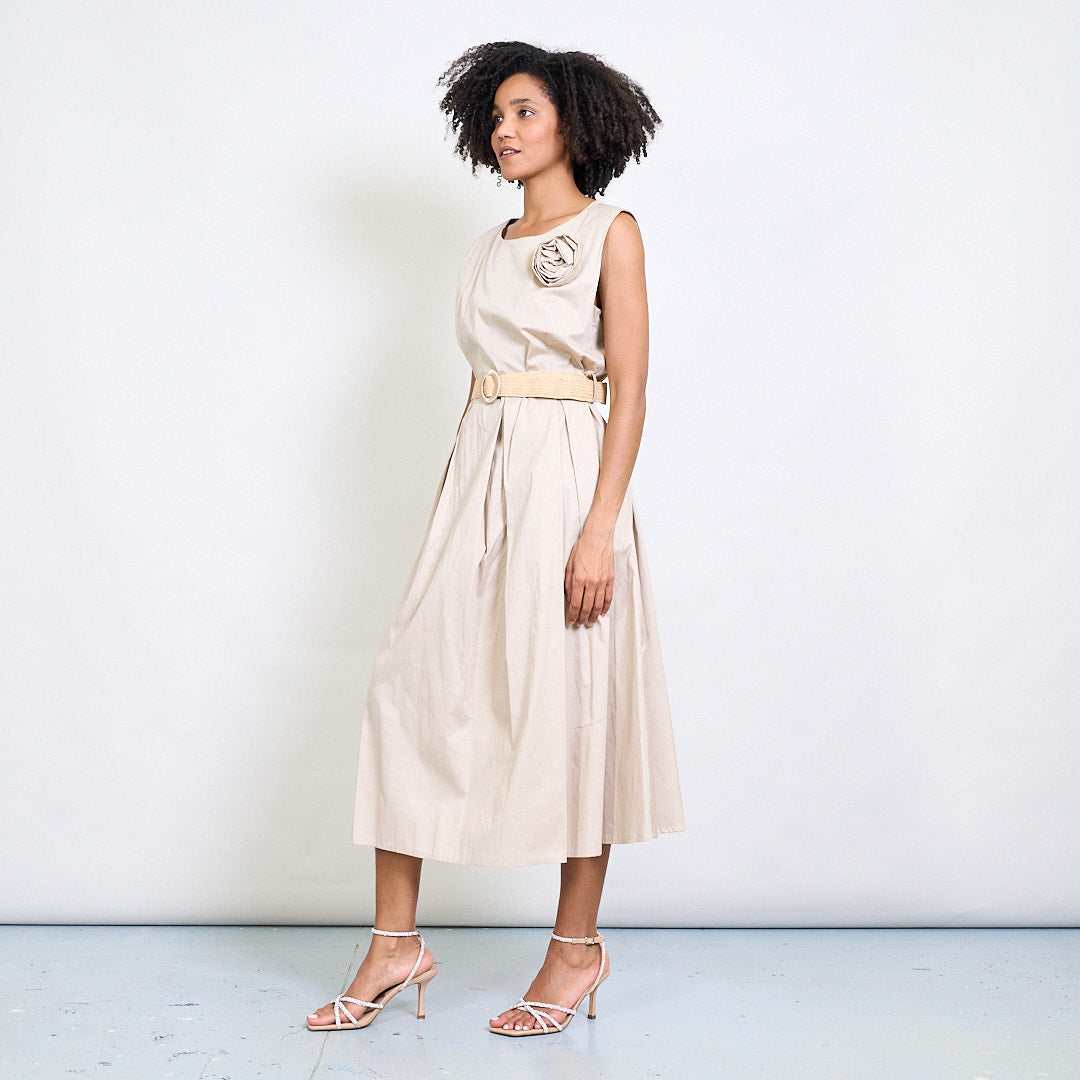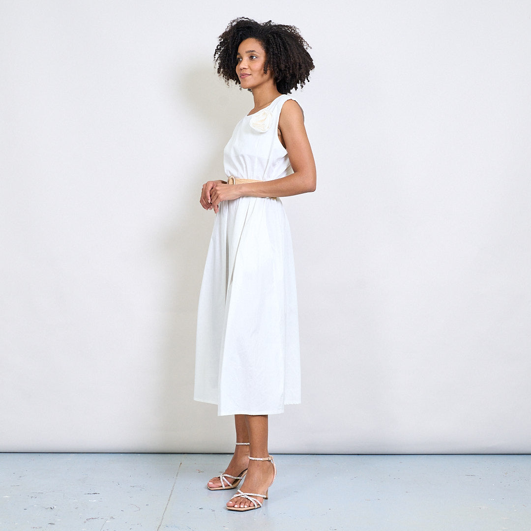 Minimalistisk blomsterapplikationsbæltet ærmeløs Midi -kjole Engros