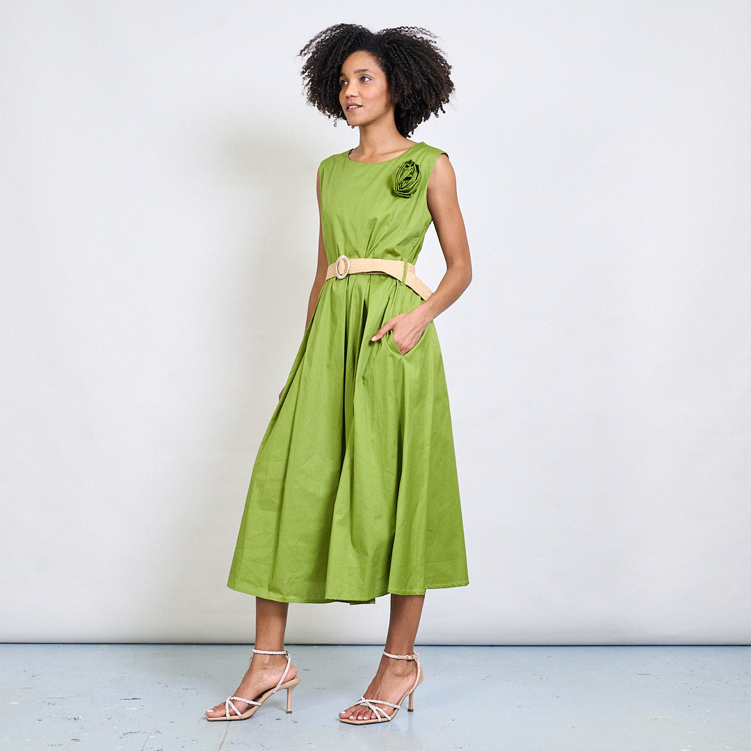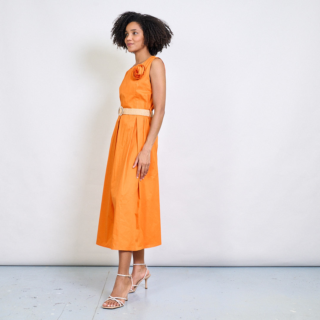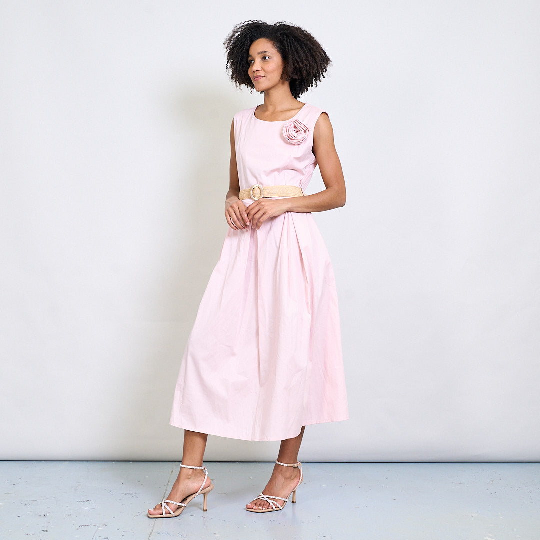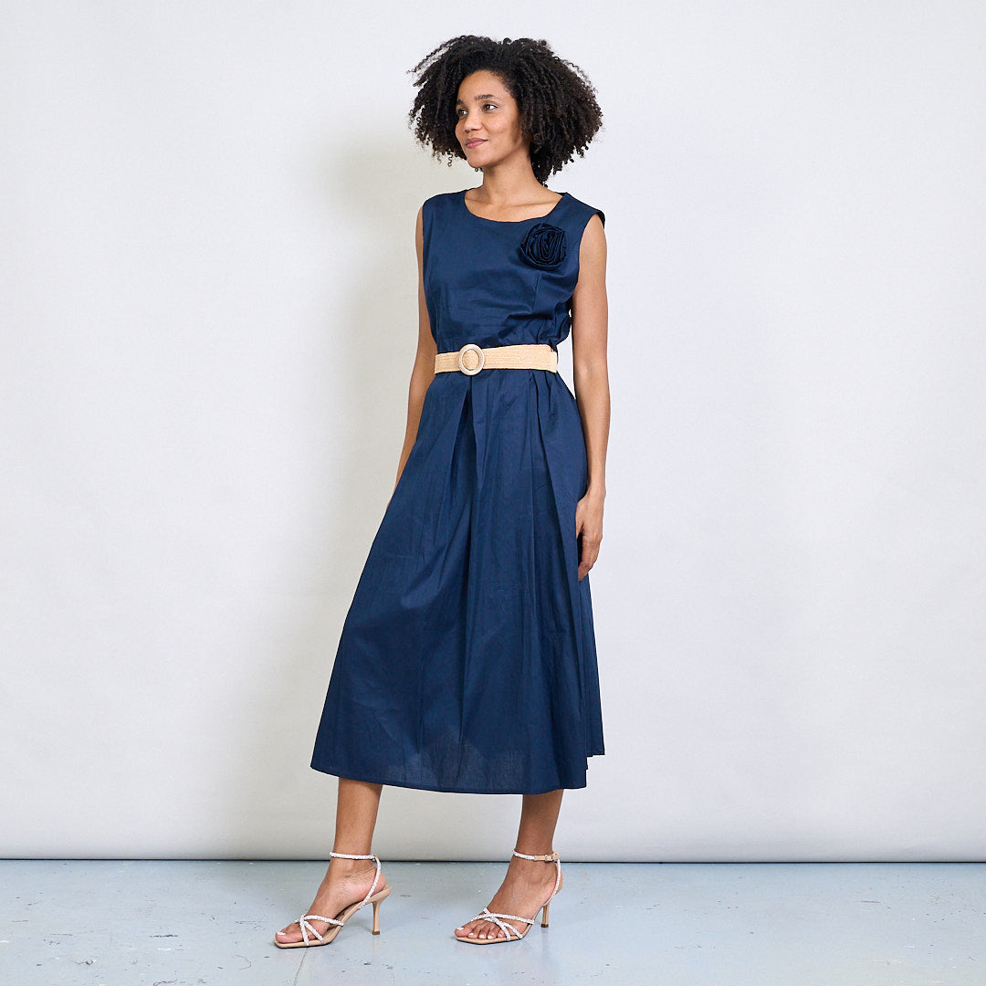Minimalistisk blomsterapplikationsbæltet ærmeløs Midi -kjole Engros