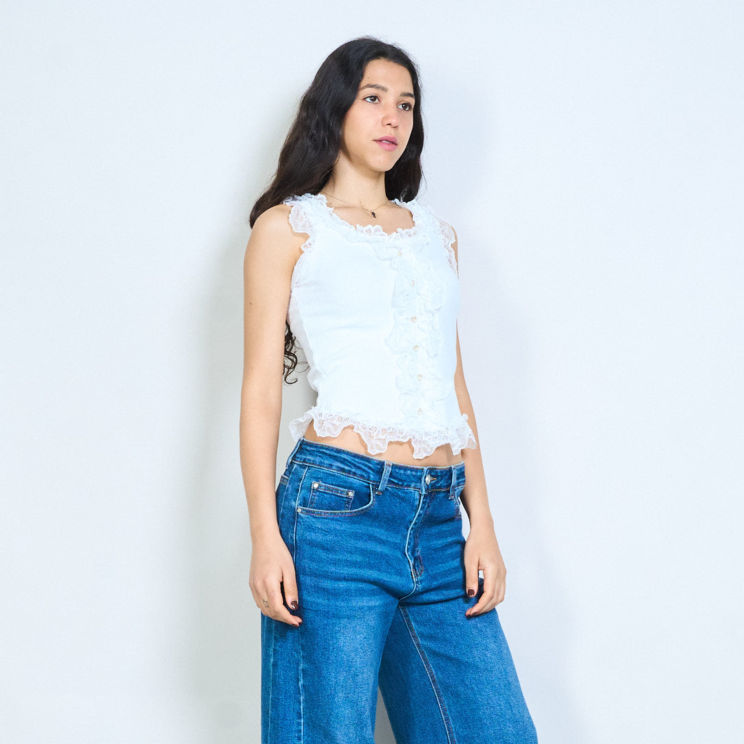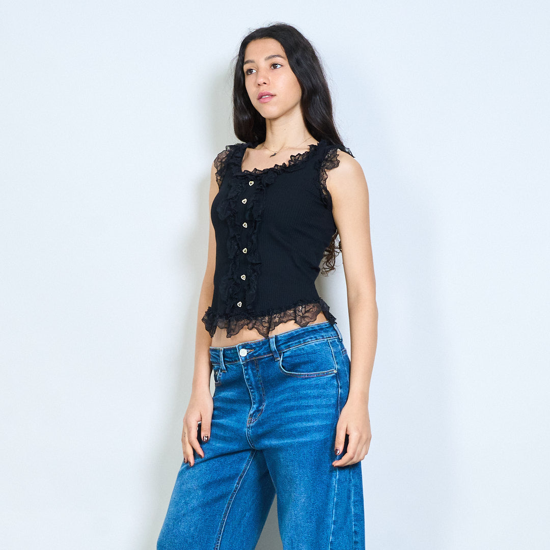 Ribbet blonde flæse trim hjerte knap ærmeløs top engros