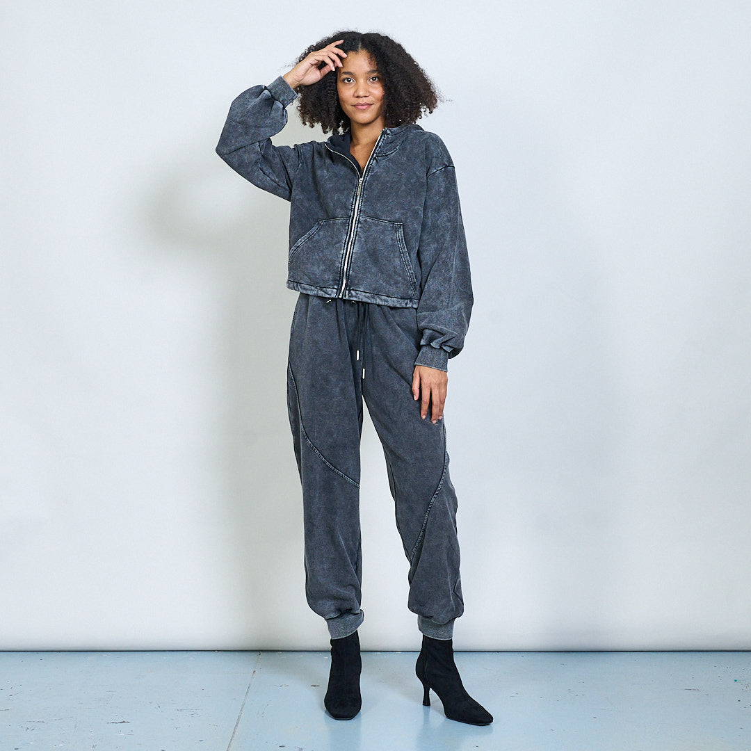 Zip hættetrøje og joggerbukser vasket loungewear sæt engros