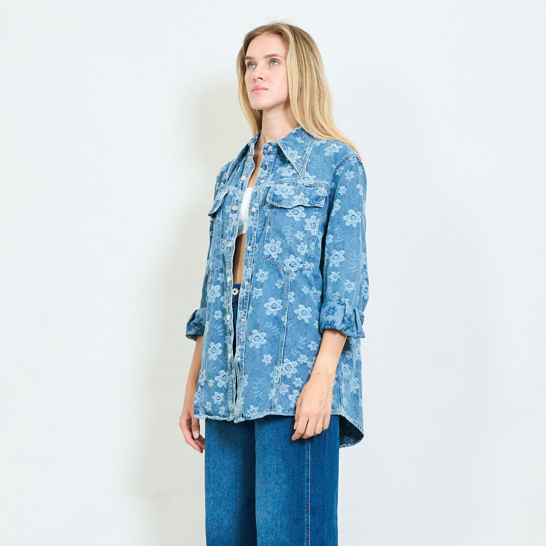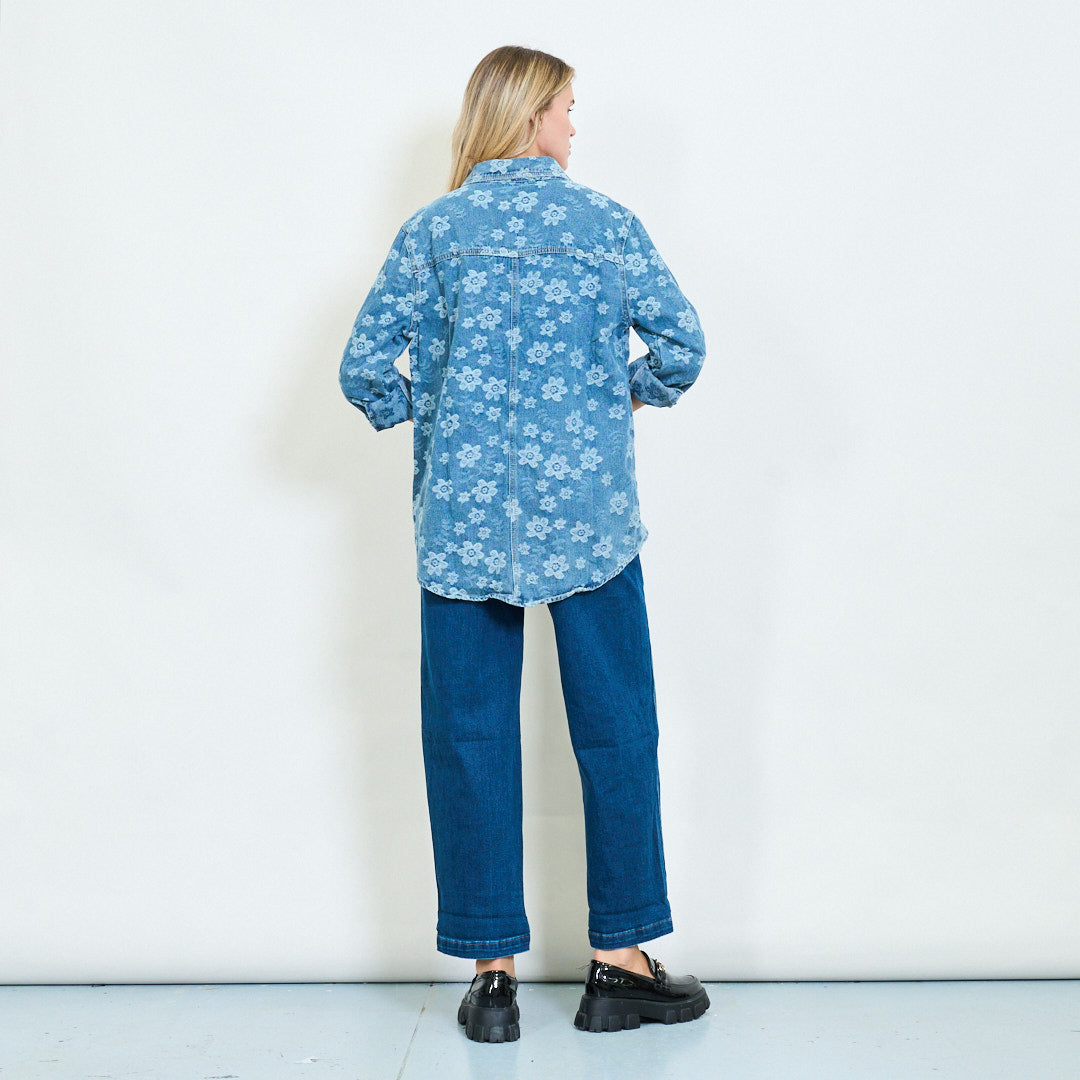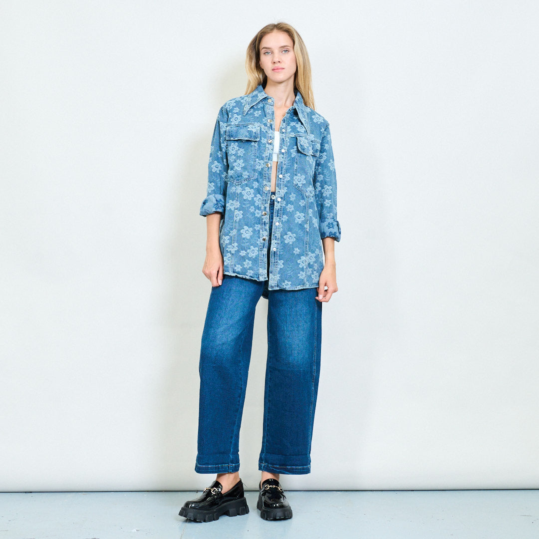 Overdimensioneret blomsterbroderet denim skjorte engros