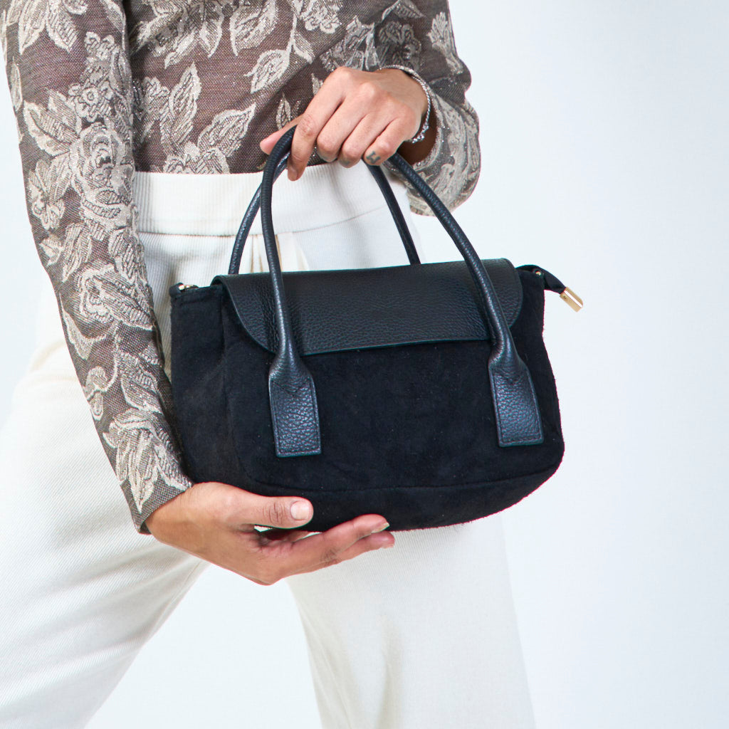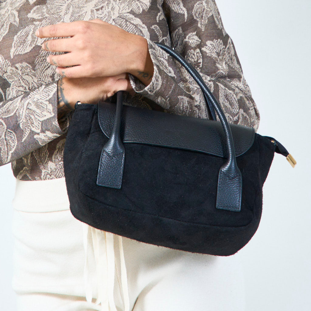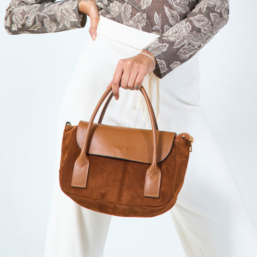 - Blød ruskindekrop med strukturerede læderhåndtag