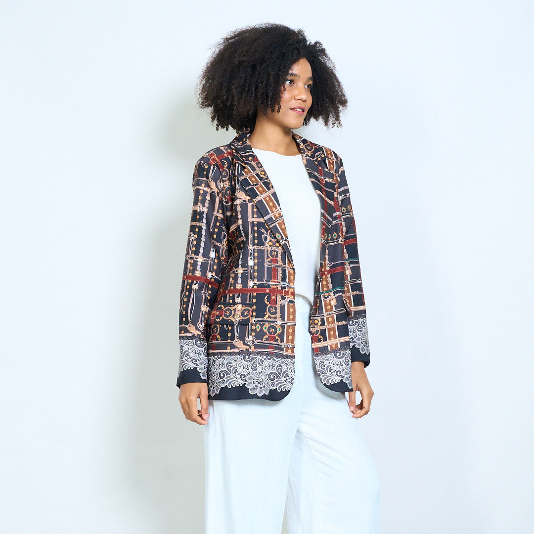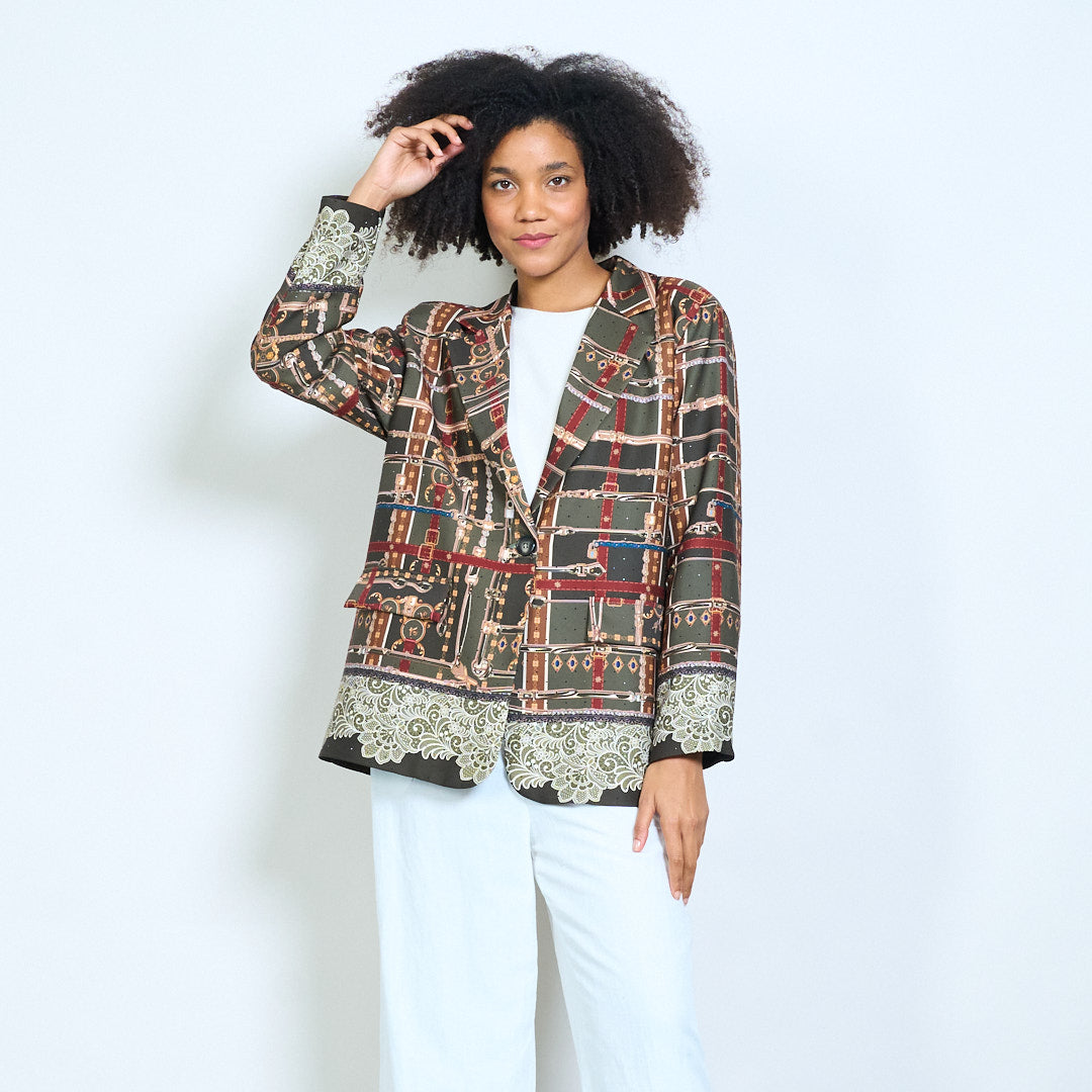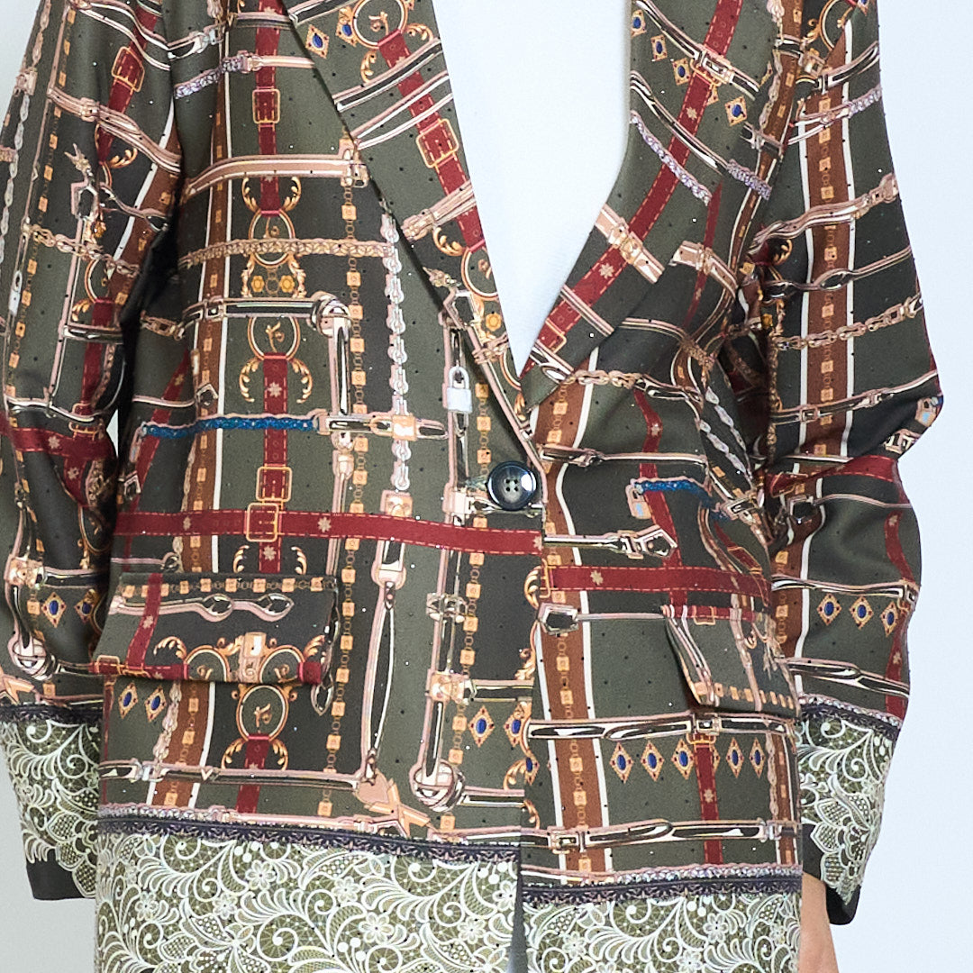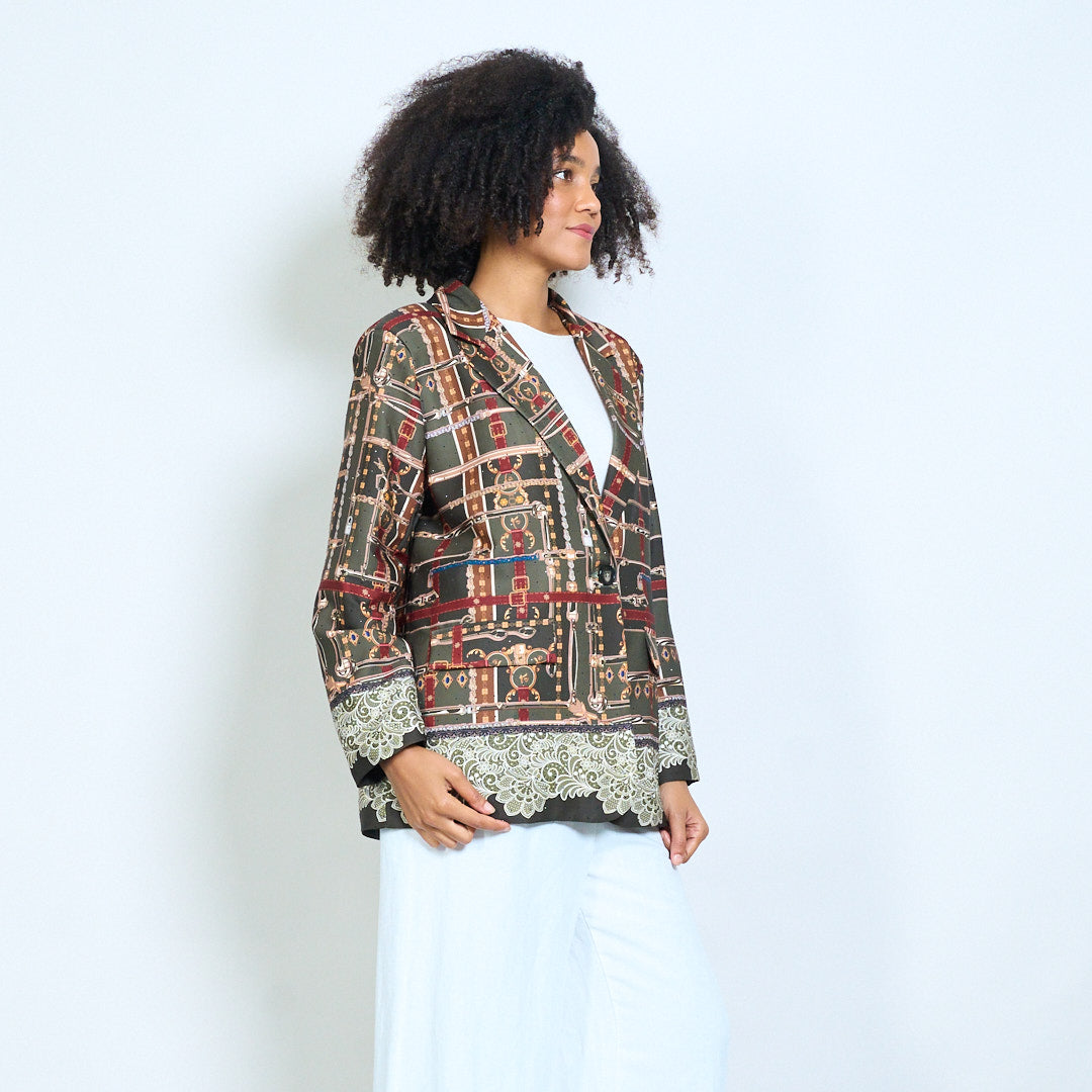 Skræddersyet blazer med kæde- og bæltetryk med enkelt knap og trykt blondekant engros