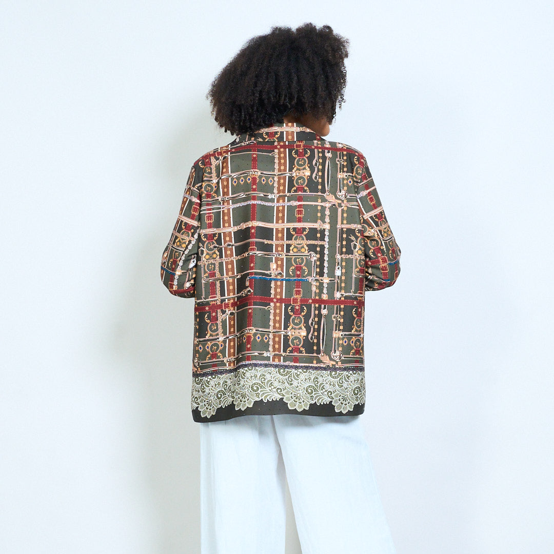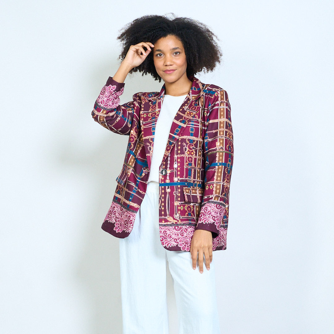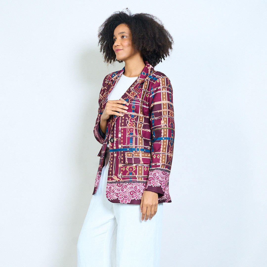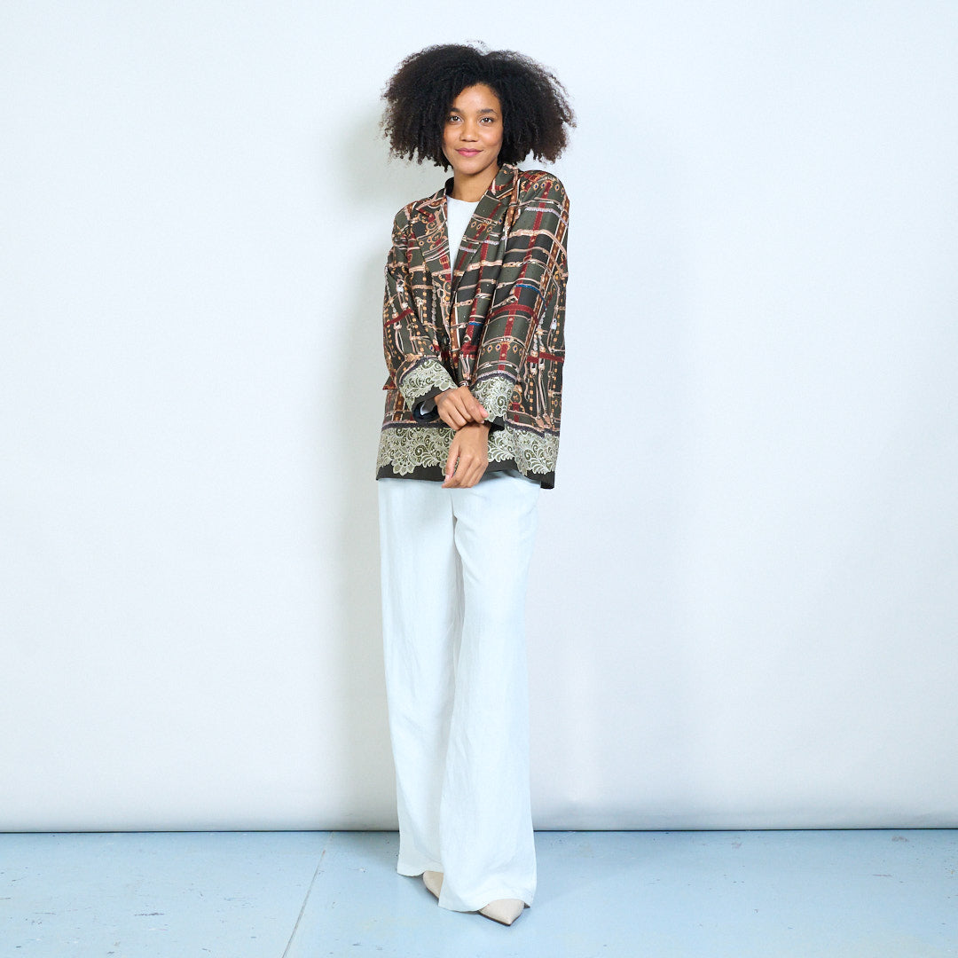 Skræddersyet blazer med kæde- og bæltetryk med enkelt knap og trykt blondekant engros
