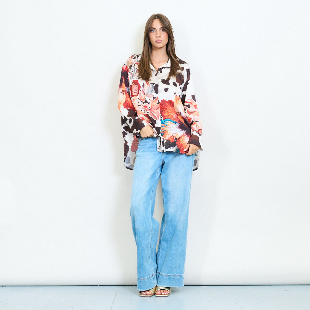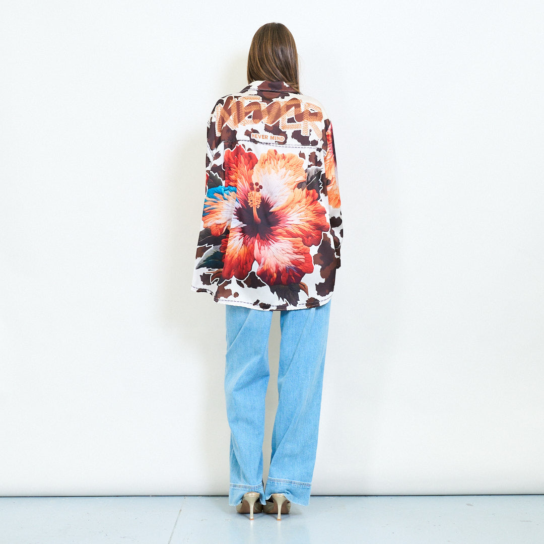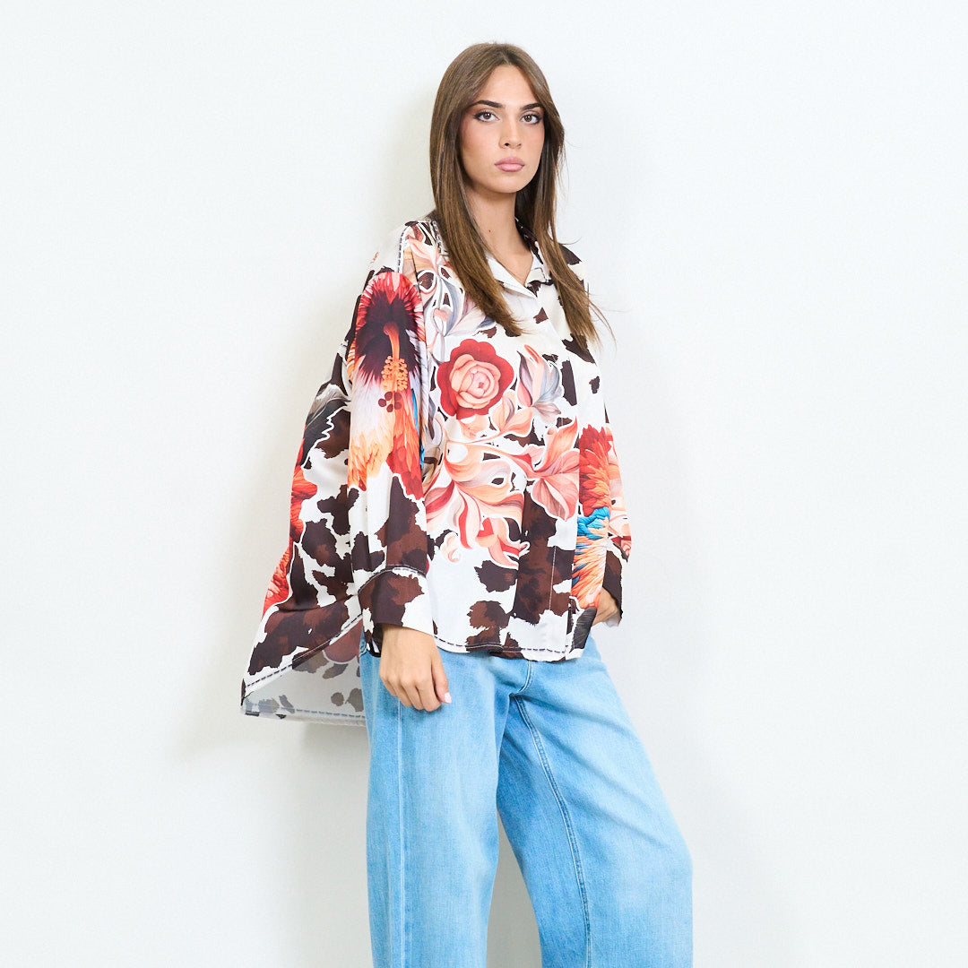 - Kühne Satinblusenmischung übergroße Blumen- und Tierdruckmuster