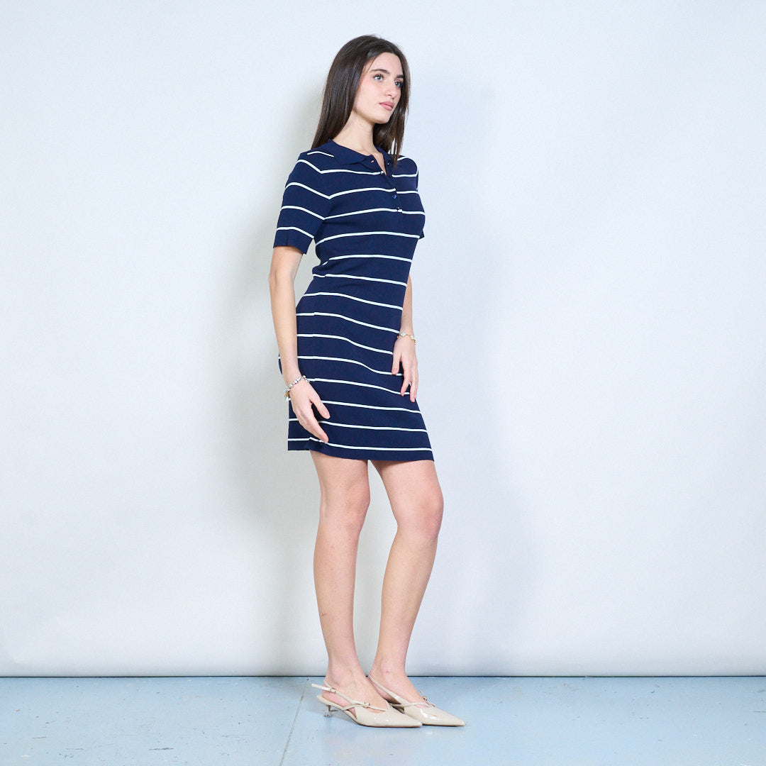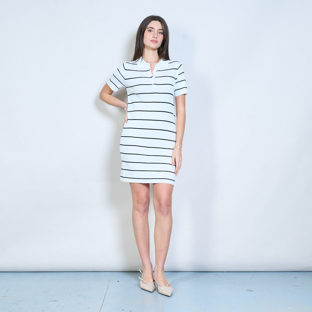 Gestreiftes, kurzärmliges, figurbetontes Strickkleid mit Polokragen im Großhandel