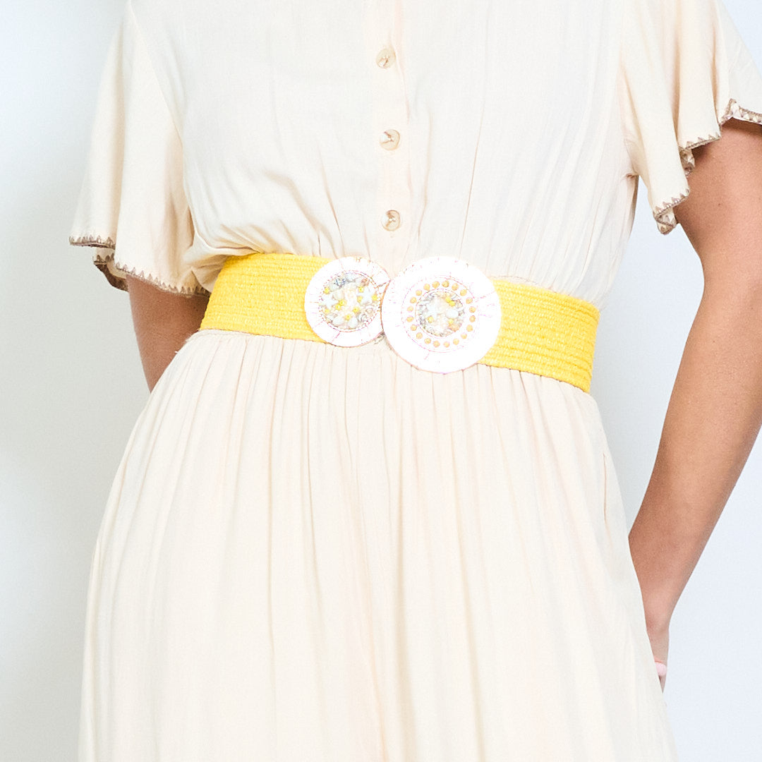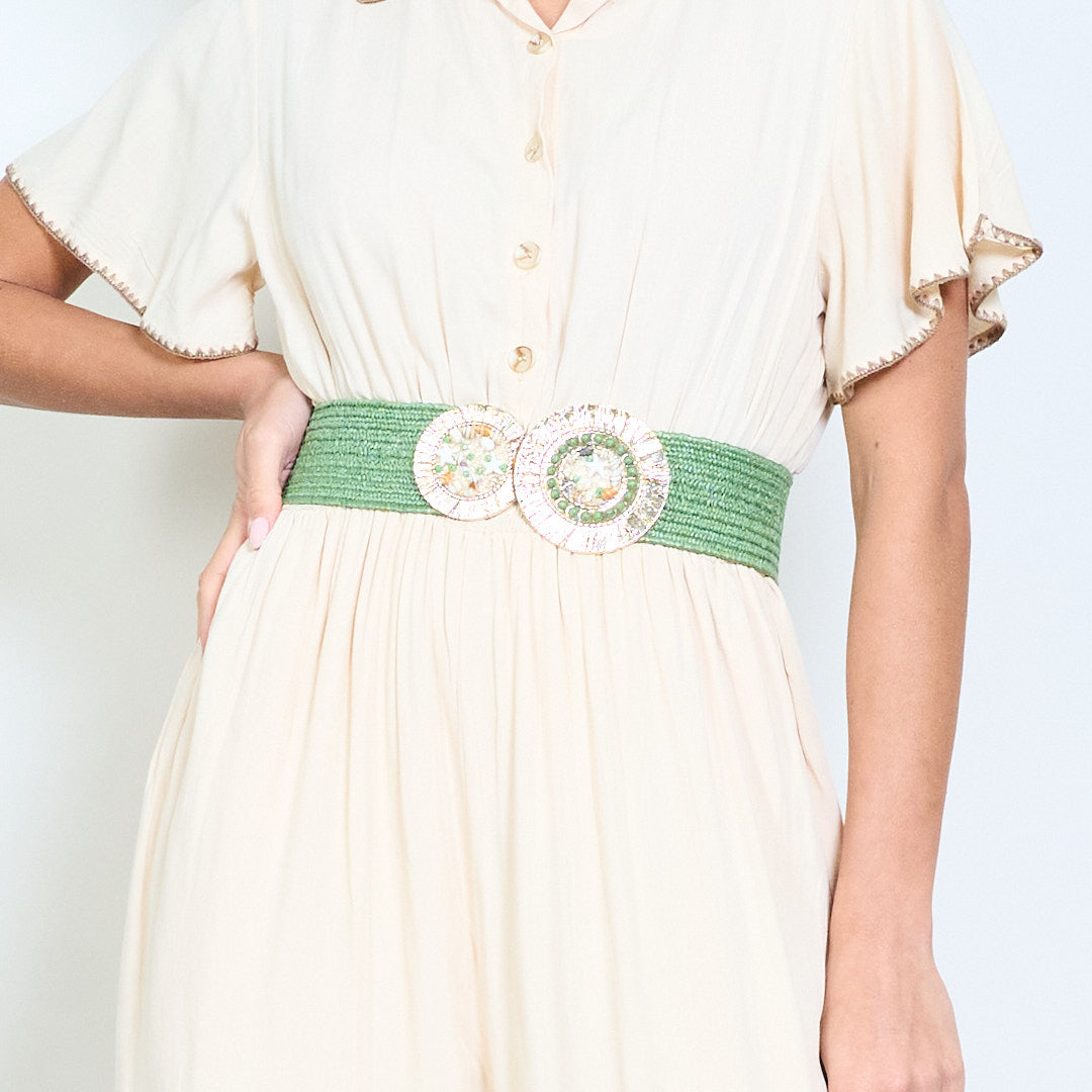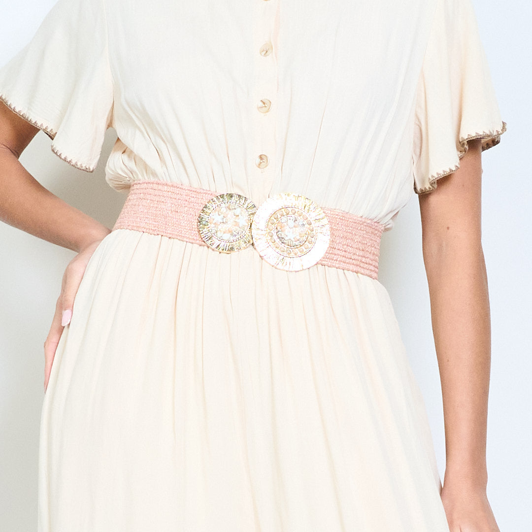 - Die dekorative runde Schnalle bildet einen raffinierten Blickfang an der Taille