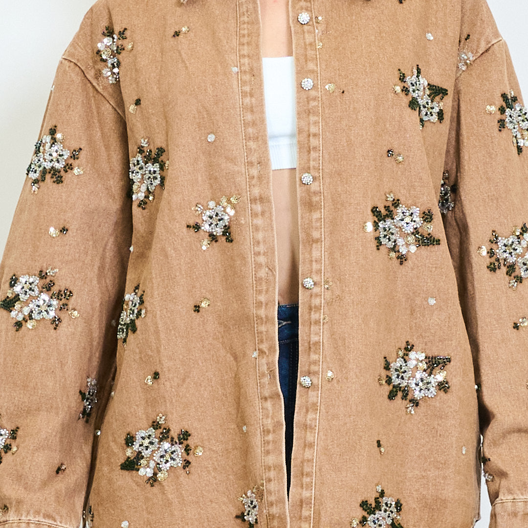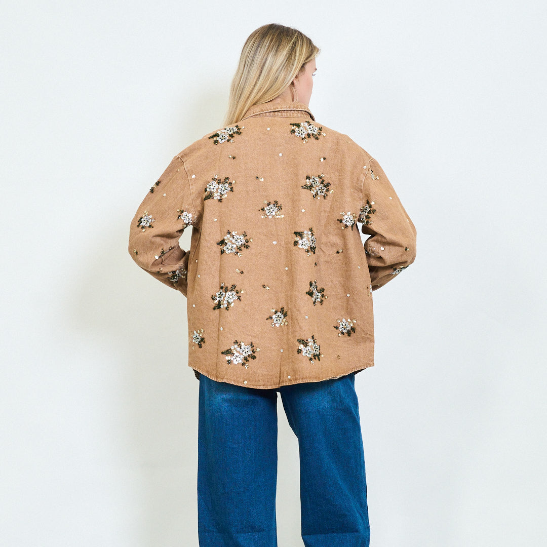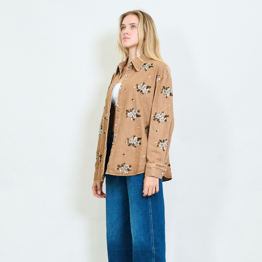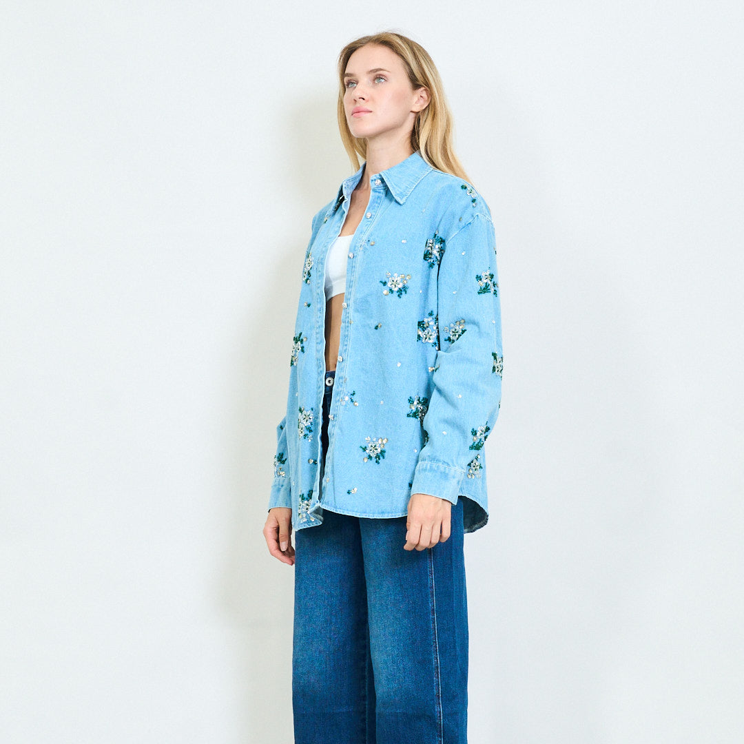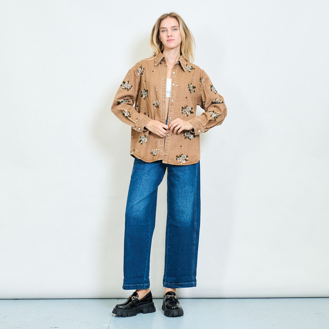 Blumenperlen bestickter Denim -Hemd Großhandel